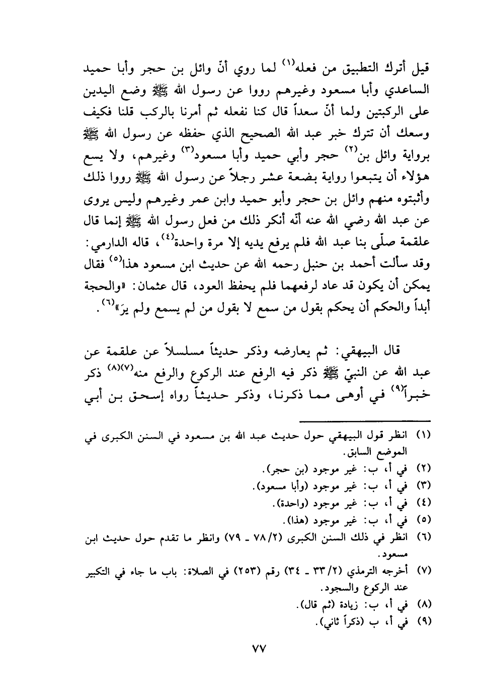 قيل أترك التطبيق من فعله لما رُوِيَ أَن وَائِل بن حجر وَأَبا حميد السَّاعِدِيّ وَأَبا مَسْعُود وَغَيرهم رووا عَن رَسُول الله - صَلَّى اللَّهُ عَلَيْهِ وَسَلَّم َ - وضع الْيَدَيْنِ على الرُّكْبَتَيْنِ وَلما أَن سَعْدا قَالَ كُنَّا نفعله ثمَّ أمرنَا بالركب قُلْنَا فَكيف وسعك أَن تتْرك خبر عبد الله الصَّحِيح الَّذِي حفظه عَن رَسُول الله - صَلَّى اللَّهُ عَلَيْهِ وَسَلَّم َ - بِرِوَايَة وَائِل بن حجر وَأبي حميد وَأَبا مَسْعُود وَغَيرهم، وَلَا يسع هَؤُلَاءِ أَن يتبعوا رِوَايَة بضعَة عشر رجلا عَن رَسُول الله - صَلَّى اللَّهُ عَلَيْهِ وَسَلَّم َ - رووا ذَلِك وأثبتوه مِنْهُم وَائِل بن حجر وَأَبُو حميد وَابْن عمر وَغَيرهم وَلَيْسَ يرْوى عَن عبد الله رَضِي الله عَنهُ أَنه أنكر ذَلِك من فعل رَسُول الله - صَلَّى اللَّهُ عَلَيْهِ وَسَلَّم َ - إِنَّمَا قَالَ عَلْقَمَة صلى بِنَا عبد الله فَلم يرفع يَدَيْهِ إِلَّا مرّة وَاحِدَة، قَالَه الدَّارمِيّ: وَقد سَأَلت أَحْمد بن حَنْبَل رَحمَه الله عَن حَدِيث ابْن مَسْعُود هَذَا فَقَالَ يُمكن أَن يكون قد عَاد لرفعهما فَلم يحفظ الْعود، قَالَ عُثْمَان: " وَالْحجّة أبدا وَالْحكم أَن يحكم بقول من سمع لَا بقول من لم يسمع وَلم ير ".