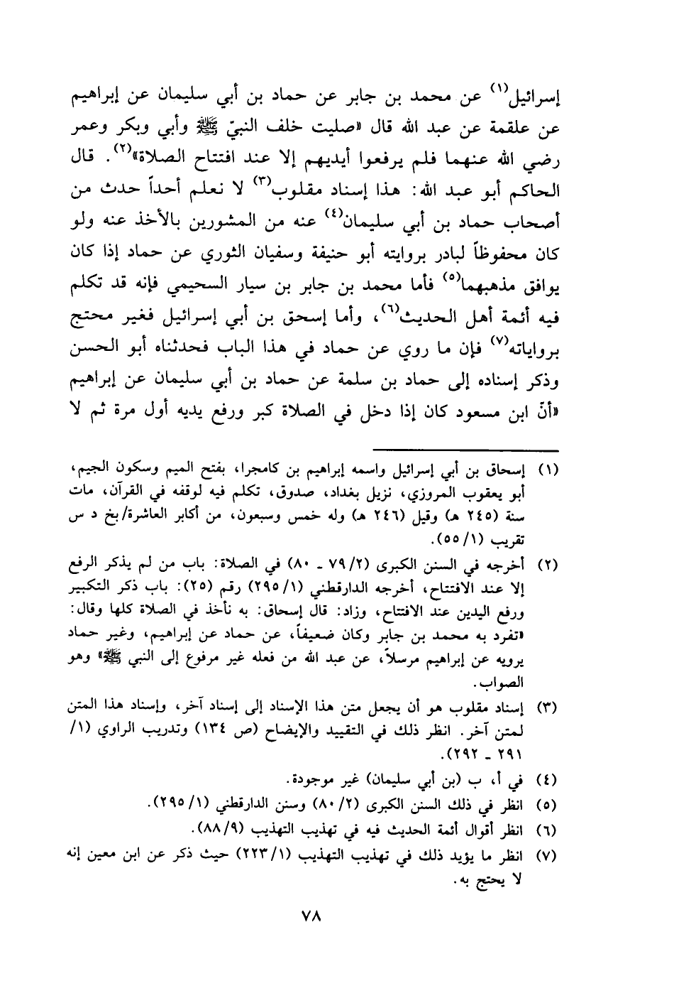إِسْرَائِيل عَن مُحَمَّد بن جَابر عَن حَمَّاد بن أبي سُلَيْمَان عَن إِبْرَاهِيم عَن عَلْقَمَة عَن عبد الله قَالَ " صليت خلف النَّبِي - صَلَّى اللَّهُ عَلَيْهِ وَسَلَّم َ - وَأبي بكر وَعمر رَضِي الله عَنْهُمَا فَلم يرفعوا أَيْديهم إِلَّا عِنْد افْتِتَاح الصَّلَاة ". قَالَ الْحَاكِم أَبُو عبد الله: هَذَا إِسْنَاد مقلوب لَا نعلم أحدا حدث من أَصْحَاب حَمَّاد بن أبي سُلَيْمَان عَنهُ من المشورين بِالْأَخْذِ عَنهُ وَلَو كَانَ مَحْفُوظًا لبادر بروايته أَبُو حنيفَة وسُفْيَان الثَّوْريّ عَن حَمَّاد إِذا كَانَ يُوَافق مَذْهَبهمَا فَأَما مُحَمَّد بن جَابر بن سيار السحيمي فَإِنَّهُ قد تكلم فِيهِ أَئِمَّة أهل الحَدِيث، وَأما إِسْحَق بن أبي إِسْرَائِيل فَغير مُحْتَج بِرِوَايَاتِهِ فَإِن مَا رُوِيَ عَن حَمَّاد فِي هَذَا الْبَاب فَحَدَّثنَاهُ أَبُو الْحسن وَذكر إِسْنَاده إِلَى حَمَّاد بن سَلمَة عَن حَمَّاد بن أبي سُلَيْمَان عَن إِبْرَاهِيم " أَن ابْن مَسْعُود كَانَ إِذا دخل فِي الصَّلَاة كبر وَرفع يَدَيْهِ أول مرّة ثمَّ لَا