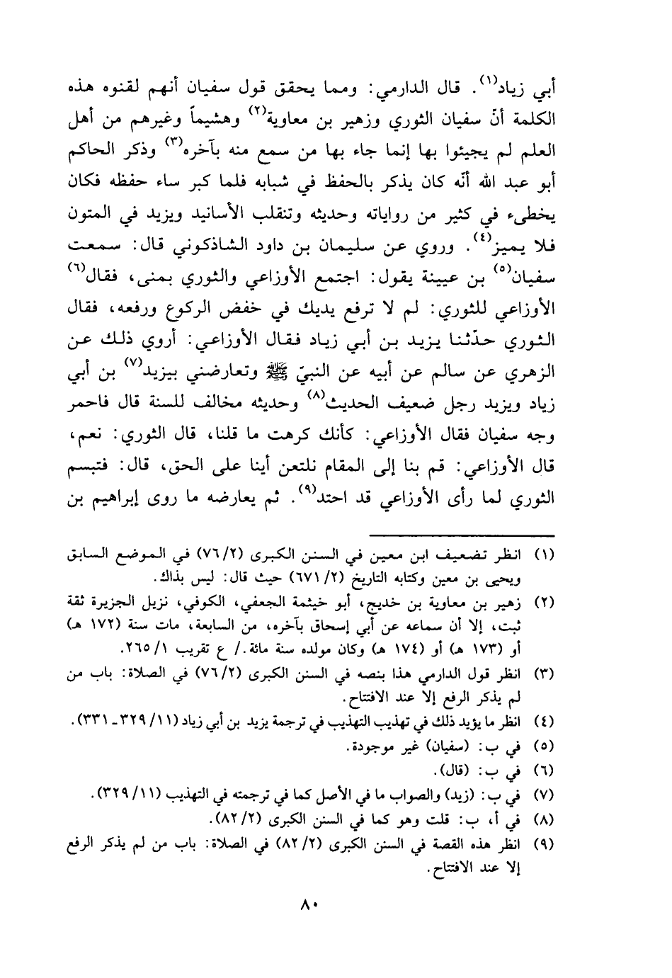 أبي زِيَاد. قَالَ الدَّارمِيّ: وَمِمَّا يُحَقّق قَول سُفْيَان أَنهم لقنوه هَذِه الْكَلِمَة أَن سُفْيَان الثَّوْريّ وَزُهَيْر بن مُعَاوِيَة وهشيما وَغَيرهم من أهل الْعلم لم يجيئوا بهَا إِنَّمَا جَاءَ بهَا من سمع مِنْهُ بِآخِرهِ وَذكر الْحَاكِم أَبُو عبد الله أَنه كَانَ يذكر بِالْحِفْظِ فِي شبابه فَلَمَّا كبر سَاءَ حفظه فَكَانَ يُخطئ فِي كثير من رواياته وَحَدِيثه وتنقلب الْأَسَانِيد وَيزِيد فِي الْمُتُون فَلَا يُمَيّز. وَرُوِيَ عَن سُلَيْمَان بن دَاوُد الشَّاذكُونِي قَالَ: سَمِعت سُفْيَان بن عينة يَقُول: اجْتمع الْأَوْزَاعِيّ وَالثَّوْري بمنى، فَقَالَ الْأَوْزَاعِيّ للثوري: لم لَا ترفع يَديك فِي خفض الرُّكُوع وَرَفعه، فَقَالَ الثَّوْريّ حَدثنَا يزِيد بن أبي زِيَاد فَقَالَ الْأَوْزَاعِيّ: أروي ذَلِك عَن الزُّهْرِيّ عَن سَالم عَن أَبِيه عَن النَّبِي - صَلَّى اللَّهُ عَلَيْهِ وَسَلَّم َ - وتعارضني بِيَزِيد بن أبي زِيَاد وَيزِيد رجل ضَعِيف الحَدِيث وَحَدِيثه مُخَالف للسّنة قَالَ فاحمر وَجه سُفْيَان فَقَالَ الْأَوْزَاعِيّ: كَأَنَّك كرهت مَا قُلْنَا، قَالَ الثَّوْريّ: نعم، قَالَ الْأَوْزَاعِيّ: قُم بِنَا إِلَى الْمقَام نلتعن أَيّنَا على الْحق، قَالَ: فَتَبَسَّمَ الثَّوْريّ لما رأى الْأَوْزَاعِيّ قد احتد. ثمَّ يُعَارضهُ مَا رُوِيَ إِبْرَاهِيم بن