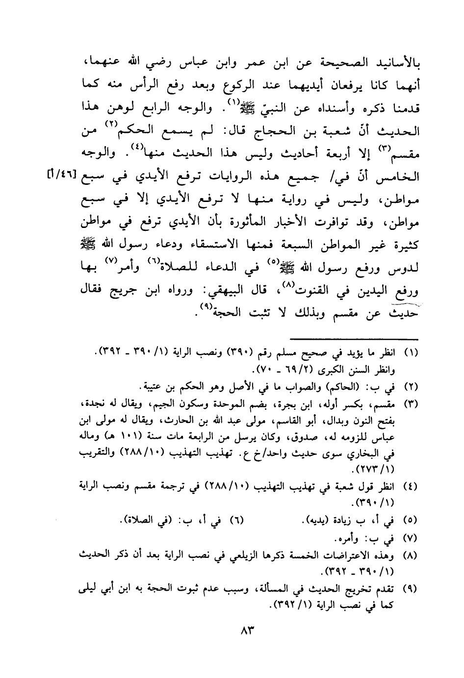 بِالْأَسَانِيدِ الصَّحِيحَة عَن ابْن عمر وَابْن عَبَّاس رَضِي الله عَنْهُمَا، أَنَّهُمَا كَانَا يرفعان أَيْدِيهِمَا عِنْد الرُّكُوع وَبعد رفع الرَّأْس مِنْهُ كَمَا قدمنَا ذكره وأسنداه عَن النَّبِي - صَلَّى اللَّهُ عَلَيْهِ وَسَلَّم َ -. وَالْوَجْه الرَّابِع لوهن هَذَا الحَدِيث أَن شُعْبَة بن الْحجَّاج قَالَ: لم يسمع الحكم من مقسم إِلَّا أَرْبَعَة أَحَادِيث وَلَيْسَ هَذَا الحَدِيث مِنْهَا. وَالْوَجْه الْخَامِس أَن فِي / جَمِيع هَذِه الرِّوَايَات ترفع الْأَيْدِي فِي سبع مَوَاطِن، وَلَيْسَ فِي رِوَايَة مِنْهَا لَا ترفع الْأَيْدِي إِلَّا فِي سبع مَوَاطِن، وَقد توافرت الْأَخْبَار المأثورة بِأَن الْأَيْدِي ترفع فِي مَوَاطِن كَثِيرَة غير المواطن السَّبْعَة فَمِنْهَا الاسْتِسْقَاء وَدُعَاء رَسُول الله - صَلَّى اللَّهُ عَلَيْهِ وَسَلَّم َ - لدوس وَرفع رَسُول الله - صَلَّى اللَّهُ عَلَيْهِ وَسَلَّم َ - فِي الدُّعَاء للصَّلَاة وَأمر بهَا وَرفع الْيَدَيْنِ فِي الْقُنُوت، قَالَ الْبَيْهَقِيّ: وَرَوَاهُ ابْن جريج فَقَالَ حَدِيث عَن مقسم وَبِذَلِك لَا تثبت الْحجَّة.