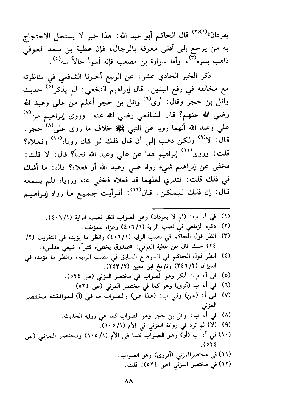 ذكر الْخَبَر الْحَادِي عشر: عَن الرّبيع أخبرنَا الشَّافِعِي فِي مناظرته مَعَ مخالفه فِي رفع الْيَدَيْنِ. قَالَ إِبْرَاهِيم النَّخعِيّ: لم يذكر حَدِيث وَائِل بن حجر وَقَالَ: أرى وَائِل بن حجر أعلم من عَليّ وَعبد الله رَضِي الله عَنْهُم؟ قَالَ الشَّافِعِي رَضِي الله عَنهُ: وروى إِبْرَاهِيم من عَليّ وَعبد الله أَنَّهُمَا رويا عَن النَّبِي - صَلَّى اللَّهُ عَلَيْهِ وَسَلَّم َ - خلاف مَا روى على حجر. قَالَ: لَا وَلَكِن ذهب إِلَى أَن قَالَ ذَلِك لَو كَانَ روياه وفعلاه؟ قلت: وروى إِبْرَاهِيم هَذَا عَن عَليّ وَعبد الله نصا؟ قَالَ: لَا قلت: فخفى عَن إِبْرَاهِيم شَيْء رَوَاهُ عَليّ وَعبد الله أَو فعلاه؟ قَالَ: مَا أَشك فِي ذَلِك قلت: فتدري لعلهما قد فعلاه فخفي عَنهُ وروياه فَلم يسمعهُ قَالَ: إِن ذَلِك ليمكن. قَالَ: أَفَرَأَيْت جَمِيع مَا رَوَاهُ إِبْرَاهِيم