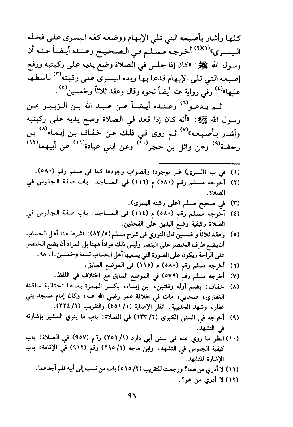 كلهَا وَأَشَارَ بِأُصْبُعِهِ الَّتِي تلِي الْإِبْهَام وَوَضعه كَفه الْيُسْرَى على فَخذه الْيُسْرَى " أخرجه مُسلم فِي الصَّحِيح وَعِنْده أَيْضا عَنهُ أَن رَسُول الله - صَلَّى اللَّهُ عَلَيْهِ وَسَلَّم َ -: " كَانَ إِذا جلس فِي الصَّلَاة وضع يَدَيْهِ على رُكْبَتَيْهِ وَرفع إصبعه الَّتِي تلِي الْإِبْهَام فَدَعَا بهَا وَيَده الْيُسْرَى على ركبته باسطها عَلَيْهَا " وَفِي رِوَايَة عَنهُ أَيْضا نَحوه وَقَالَ وَعقد ثَلَاثًا وَخمسين.