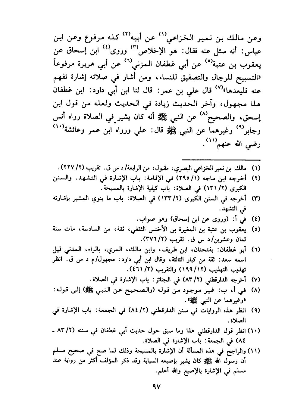 وَعَن مَالك بن نمير الْخُزَاعِيّ عَن أَبِيه كُله مَرْفُوع وَعَن ابْن عَبَّاس: أَنه سُئِلَ عَنهُ فَقَالَ: هُوَ الْإِخْلَاص وروى ابْن إِسْحَاق عَن يَعْقُوب بن عتبَة عَن أبي غطفان الْمُزنِيّ عَن أبي هُرَيْرَة مَرْفُوعا " التَّسْبِيح للرِّجَال والتصفيق للنِّسَاء، وَمن أَشَارَ فِي صلَاته إِشَارَة تفهم عَنهُ فليعدها " قَالَ عَليّ بن عمر: قَالَ لنا ابْن أبي دَاوُد: ابْن غطفان هَذَا مَجْهُول، وَآخر الحَدِيث زِيَادَة فِي الحَدِيث وَلَعَلَّه من قَول ابْن إِسْحَق، وَالصَّحِيح عَن النَّبِي - صَلَّى اللَّهُ عَلَيْهِ وَسَلَّم َ - أَنه كَانَ يُشِير فِي الصَّلَاة رَوَاهُ أنس وَجَابِر وَغَيرهمَا عَن النَّبِي - صَلَّى اللَّهُ عَلَيْهِ وَسَلَّم َ - قَالَ: عَليّ وَرَوَاهُ ابْن عمر وَعَائِشَة رَضِي الله عَنْهُم.