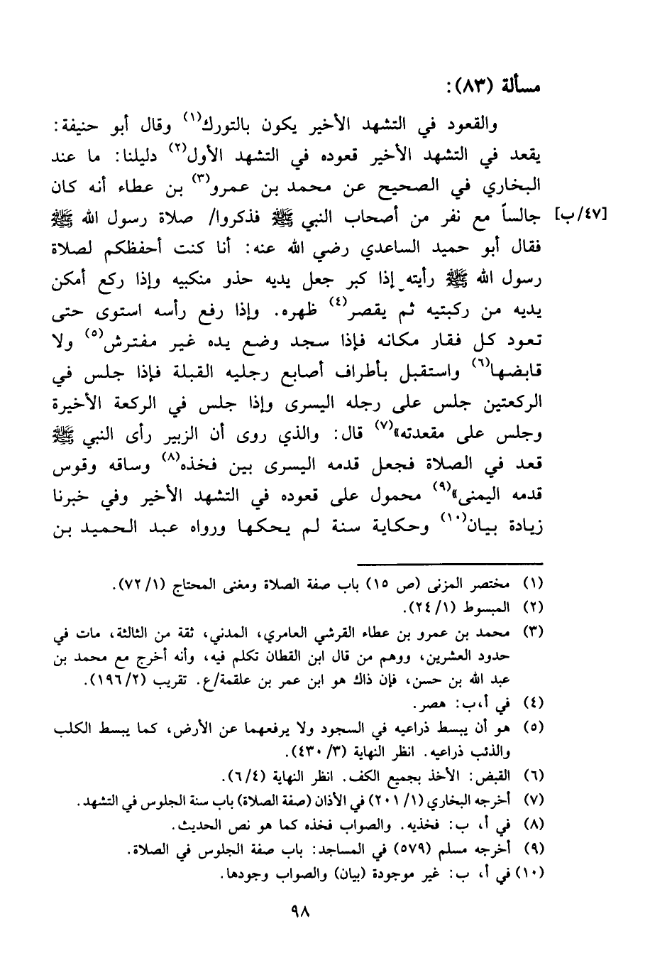 وَالْقعُود فِي التَّشَهُّد الْأَخير يكون بالتورك وَقَالَ أَبُو حنيفَة: يقْعد فِي التَّشَهُّد الْأَخير قعوده فِي التَّشَهُّد الأول دليلنا: مَا عِنْد البُخَارِيّ فِي الصَّحِيح عَن مُحَمَّد بن عَمْرو بن عَطاء أَنه كَانَ جَالِسا مَعَ نفر من أَصْحَاب النَّبِي - صَلَّى اللَّهُ عَلَيْهِ وَسَلَّم َ - فَذكرُوا / صَلَاة رَسُول الله - صَلَّى اللَّهُ عَلَيْهِ وَسَلَّم َ - فَقَالَ أَبُو حميد السَّاعِدِيّ رَضِي الله عَنهُ: أَنا كنت أحفظكم لصَلَاة رَسُول الله - صَلَّى اللَّهُ عَلَيْهِ وَسَلَّم َ - رَأَيْته إِذا كبر جعل يَدَيْهِ حَذْو مَنْكِبَيْه وَإِذا ركع أمكن يَدَيْهِ من رُكْبَتَيْهِ ثمَّ يقصر ظَهره. وَإِذا رفع رَأسه اسْتَوَى حَتَّى تعود كل فقار مَكَانَهُ فَإِذا سجد وضع يَده غير مفترش وَلَا قابضها واستقبل بأطراف أَصَابِع رجلَيْهِ الْقبْلَة فَإِذا جلس فِي الرَّكْعَتَيْنِ جلس على رجله الْيُسْرَى وَإِذا جلس فِي الرَّكْعَة الْأَخِيرَة وَجلسَ على مقعدته " قَالَ: وَالَّذِي روى أَن الزبير رأى النَّبِي - صَلَّى اللَّهُ عَلَيْهِ وَسَلَّم َ - قعد فِي الصَّلَاة فَجعل قدمه الْيُسْرَى بَين فَخذه وَسَاقه وقوس قدمه الْيُمْنَى " مَحْمُول على قعوده فِي التَّشَهُّد الْأَخير وَفِي خبرنَا زِيَادَة بَيَان وحكاية سنة لم يحكها وَرَوَاهُ عبد الحميد بن