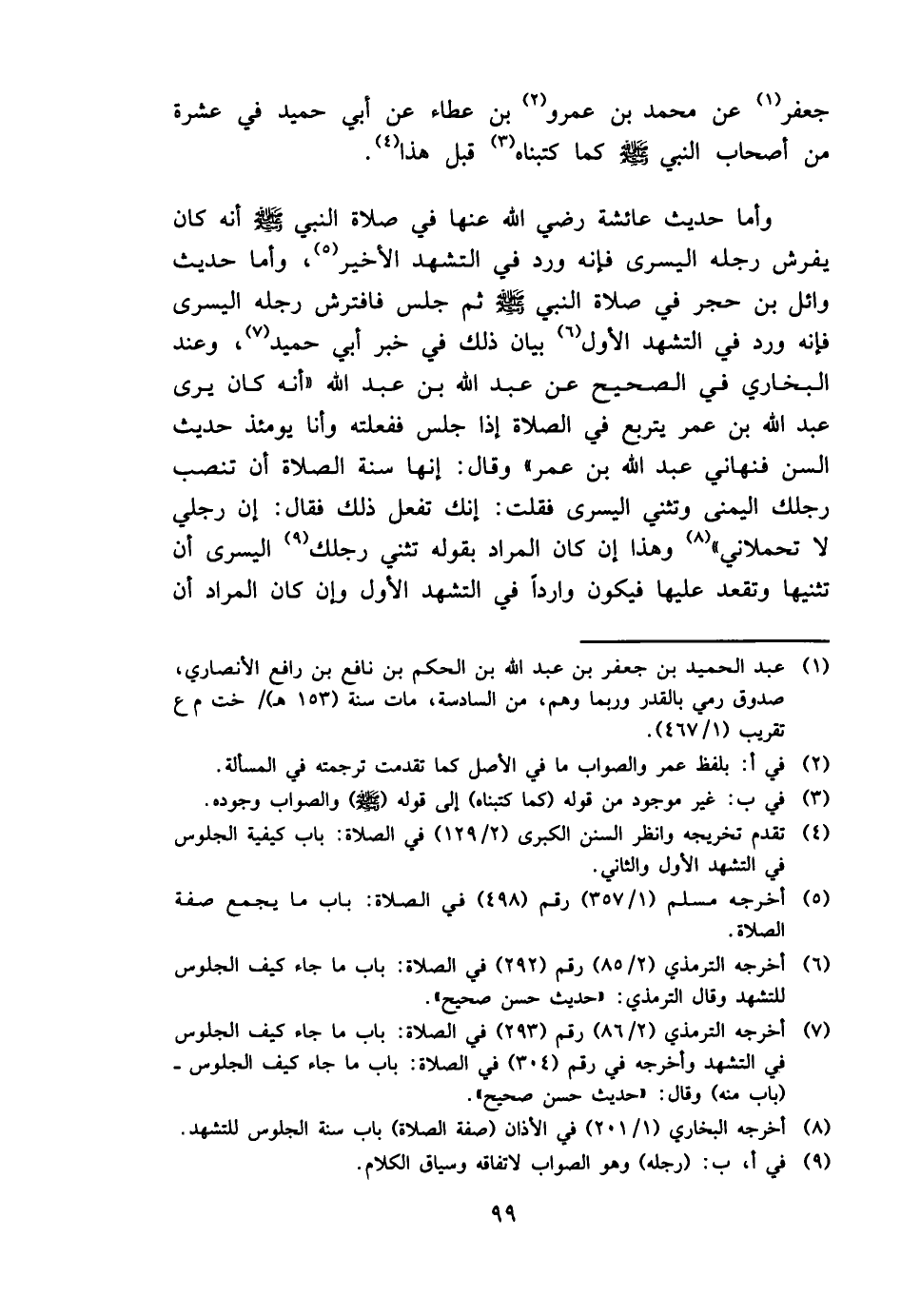 وَأما حَدِيث عَائِشَة رَضِي الله عَنْهَا فِي صَلَاة النَّبِي - صَلَّى اللَّهُ عَلَيْهِ وَسَلَّم َ - أَنه كَانَ يفرش رجله الْيُسْرَى فَإِنَّهُ ورد فِي التَّشَهُّد الْأَخير، وَأما حَدِيث وَائِل بن حجر فِي صَلَاة النَّبِي - صَلَّى اللَّهُ عَلَيْهِ وَسَلَّم َ - ثمَّ جلس فافترش رجله الْيُسْرَى فَإِنَّهُ ورد فِي التَّشَهُّد الأول بَيَان ذَلِك فِي خبر أبي حميد، وَعند البُخَارِيّ فِي الصَّحِيح عَن عبد الله بن عبد الله " أَنه كَانَ يرى عبد الله بن عمر يتربع فِي الصَّلَاة إِذا جلس ففعلته وَأَنا يَوْمئِذٍ حَدِيث السن فنهاني عبد الله بن عمر " وَقَالَ: إِنَّهَا سنة الصَّلَاة أَن تنصب رجلك الْيُمْنَى وَتثني الْيُسْرَى فَقلت: إِنَّك تفعل ذَلِك فَقَالَ: إِن رجْلي لَا تحملاني " وَهَذَا إِن كَانَ المُرَاد بقوله تثني رجلك الْيُسْرَى أَن تثنيها وتقعد عَلَيْهَا فَيكون واردا فِي التَّشَهُّد الأول وَإِن كَانَ المُرَاد أَن
