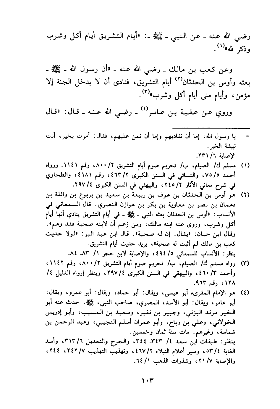 وَعَن كَعْب بن مَالك - رَضِي الله عَنهُ - " أَن رَسُول الله - صَلَّى اللَّهُ عَلَيْهِ وَسَلَّم َ - بَعثه وَأَوْس بن الْحدثَان أَيَّام التَّشْرِيق، فَنَادَى أَن لَا يدْخل الْجنَّة إِلَّا مُؤمن، وَأَيَّام منى أَيَّام أكل وَشرب ".