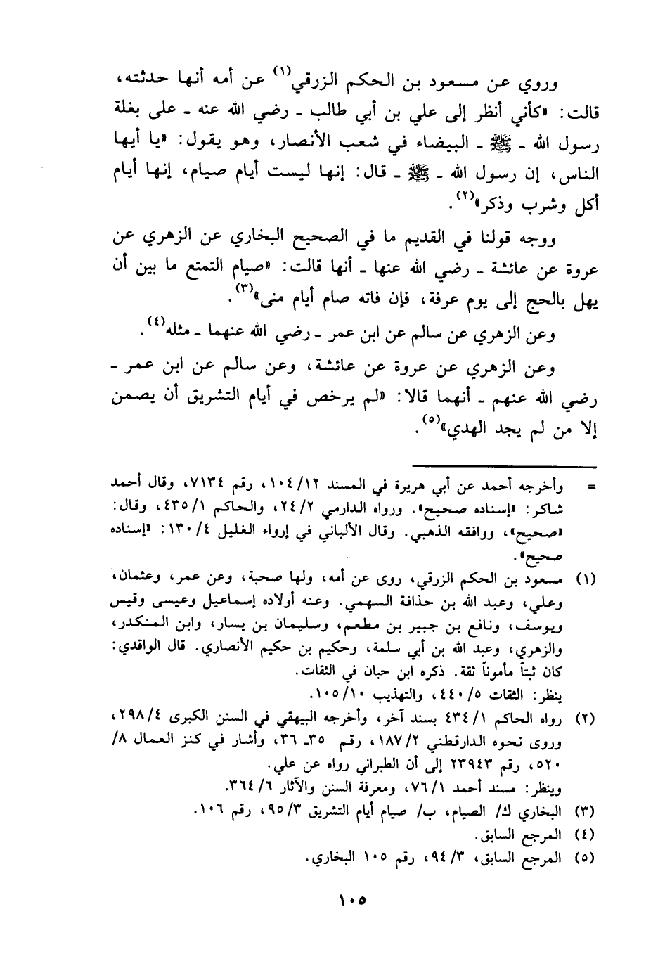 وَرُوِيَ عَن مَسْعُود بن الحكم الزرقي عَن أمه أَنَّهَا حدثته، قَالَت: " كَأَنِّي أنظر إِلَى عَليّ بن أبي طَالب - رَضِي الله عَنهُ - على بغلة رَسُول الله - صَلَّى اللَّهُ عَلَيْهِ وَسَلَّم َ - الْبَيْضَاء فِي شعب الْأَنْصَار، وَهُوَ يَقُول: " يَا أَيهَا النَّاس، إِن رَسُول الله - صَلَّى اللَّهُ عَلَيْهِ وَسَلَّم َ - قَالَ: إِنَّهَا لَيست أَيَّام صِيَام، إِنَّهَا أَيَّام أكل وَشرب وَذكر ".