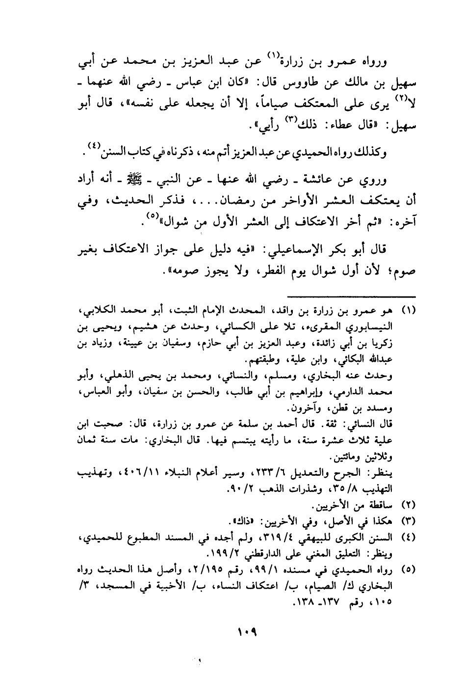 وَرَوَاهُ عَمْرو بن زُرَارَة عَن عبد الْعَزِيز بن مُحَمَّد عَن أبي سُهَيْل بن مَالك عَن طَاوُوس قَالَ: " كَانَ ابْن عَبَّاس - رَضِي الله عَنْهُمَا - لَا يرى على الْمُعْتَكف صياما، إِلَّا أَن يَجعله على نَفسه "، قَالَ أَبُو سُهَيْل: " قَالَ عَطاء: ذَلِك رَأْيِي ".
