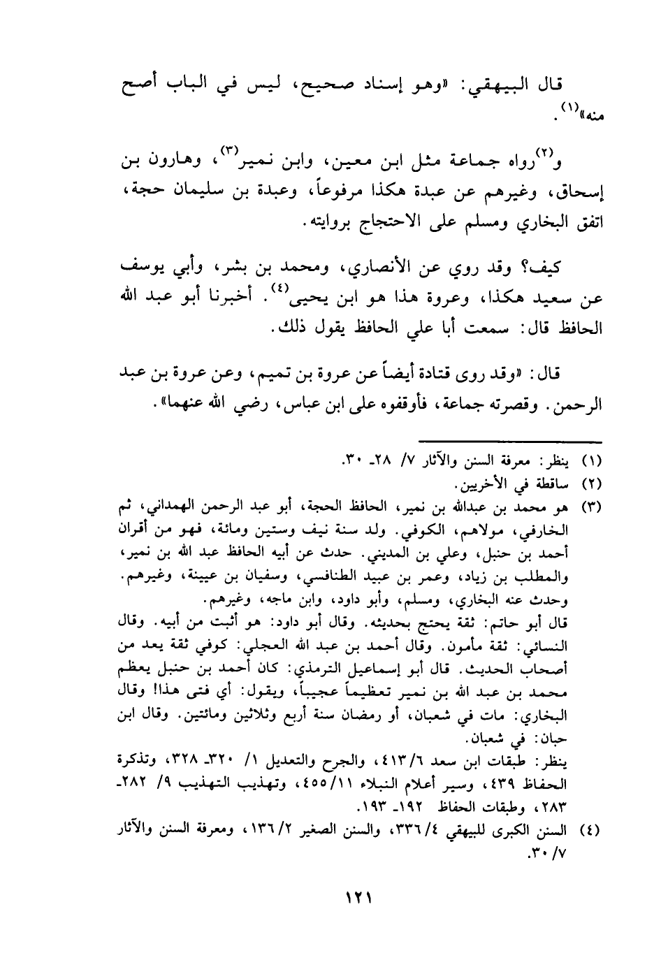 قَالَ الْبَيْهَقِيّ: " وَهُوَ إِسْنَاد صَحِيح، لَيْسَ فِي الْبَاب أصح مِنْهُ ".