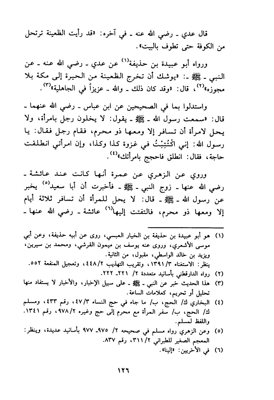 وَرَوَاهُ أَبُو عُبَيْدَة بن حُذَيْفَة عَن عدي - رَضِي الله عَنهُ - عَن النَّبِي - صَلَّى اللَّهُ عَلَيْهِ وَسَلَّم َ -: " يُوشك أَن تخرج الظعينة من الْحيرَة إِلَى مَكَّة بِلَا مجوزه "، قَالَ: " وَقد كَانَ ذَلِك - وَالله - عَزِيزًا فِي الْجَاهِلِيَّة ".