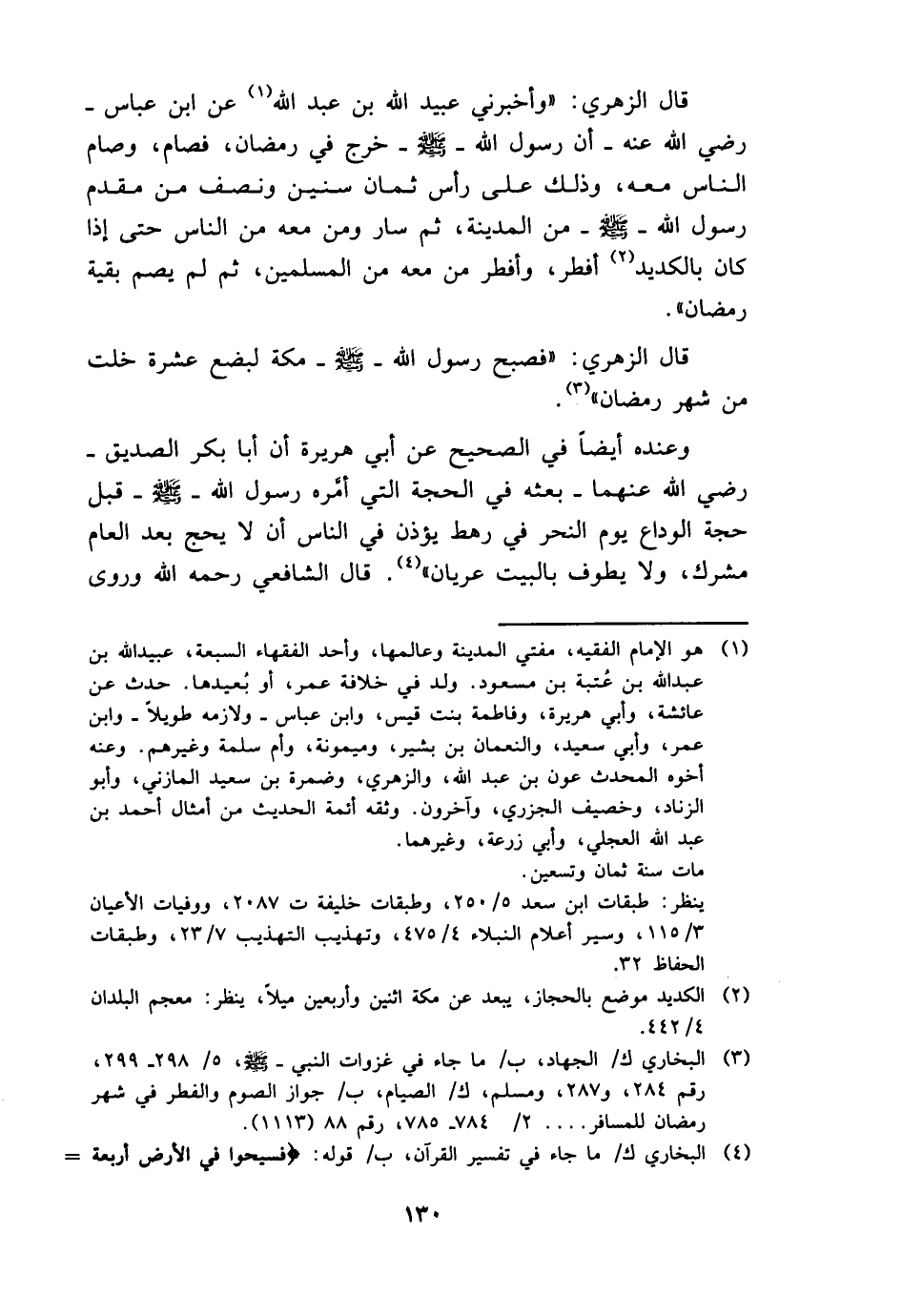 قَالَ الزُّهْرِيّ: " وَأَخْبرنِي عبيد الله بن عبد الله عَن ابْن عَبَّاس - رَضِي الله عَنهُ - أَن رَسُول الله - صَلَّى اللَّهُ عَلَيْهِ وَسَلَّم َ - خرج فِي رَمَضَان، فصَام، وَصَامَ النَّاس مَعَه، وَذَلِكَ على رَأس ثَمَان سِنِين وَنصف من مقدم رَسُول الله - صَلَّى اللَّهُ عَلَيْهِ وَسَلَّم َ - من الْمَدِينَة، ثمَّ سَار وَمن مَعَه من النَّاس حَتَّى إِذا كَانَ بالكديد أفطر، وَأفْطر من مَعَه من الْمُسلمين، ثمَّ لم يصم بَقِيَّة رَمَضَان ".