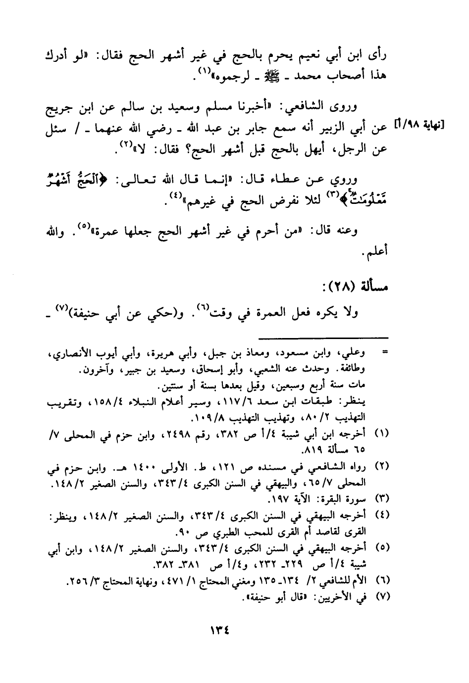 وروى الشَّافِعِي: " أخبرنَا مُسلم وَسَعِيد بن سَالم عَن ابْن جريج عَن أبي الزبير أَنه سمع جَابر بن عبد الله - رَضِي الله عَنْهُمَا - / سُئِلَ عَن الرجل، أيهل بِالْحَجِّ قبل أشهر الْحَج؟ فَقَالَ: لَا ".