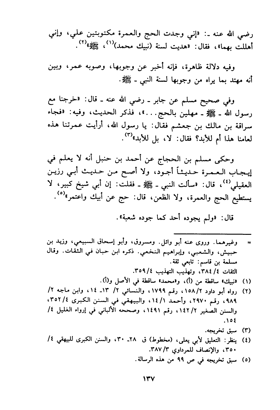 وَفِي صَحِيح مُسلم عَن جَابر - رَضِي الله عَنهُ - قَالَ: " خرجنَا مَعَ رَسُول الله - صَلَّى اللَّهُ عَلَيْهِ وَسَلَّم َ - مهلين بِالْحَجِّ ... "، فَذكر الحَدِيث، وَفِيه: " فجَاء سراقَة بن مَالك بن جعْشم فَقَالَ: يَا رَسُول الله، أرايت عُمْرَتنَا هَذِه لِعَامِنَا هَذَا أم لِلْأَبَد، فَقَالَ: لَا، بل لِلْأَبَد ".