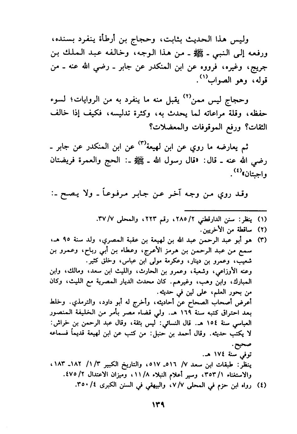 ثمَّ يُعَارضهُ مَا رُوِيَ عَن ابْن لَهِيعَة عَن ابْن الْمُنْكَدر عَن جَابر - رَضِي الله عَنهُ - قَالَ: " قَالَ رَسُول الله - صَلَّى اللَّهُ عَلَيْهِ وَسَلَّم َ -: الْحَج وَالْعمْرَة فريضتان واجبتان ".