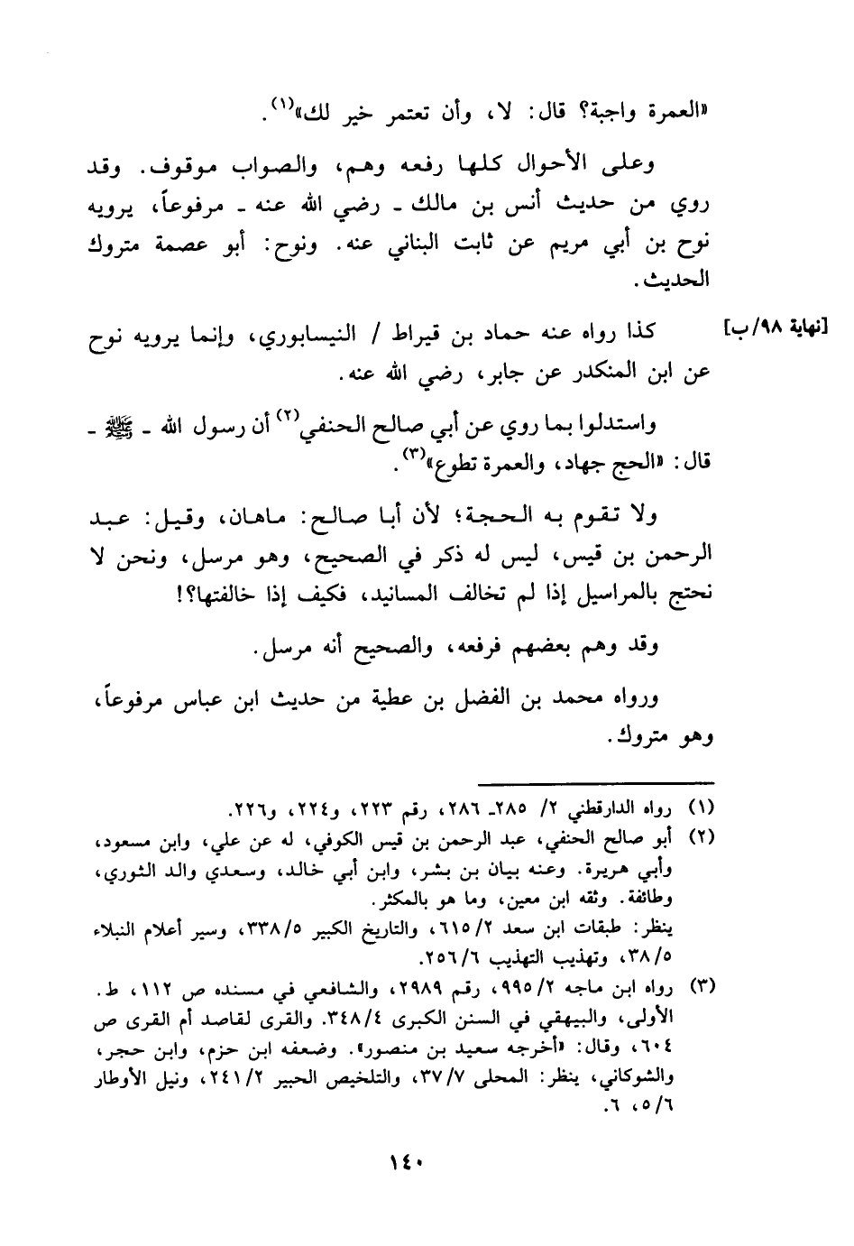 وَاسْتَدَلُّوا بِمَا رُوِيَ عَن أبي صَالح الْحَنَفِيّ أَن رَسُول الله - صَلَّى اللَّهُ عَلَيْهِ وَسَلَّم َ - قَالَ: " الْحَج جِهَاد، وَالْعمْرَة تطوع.