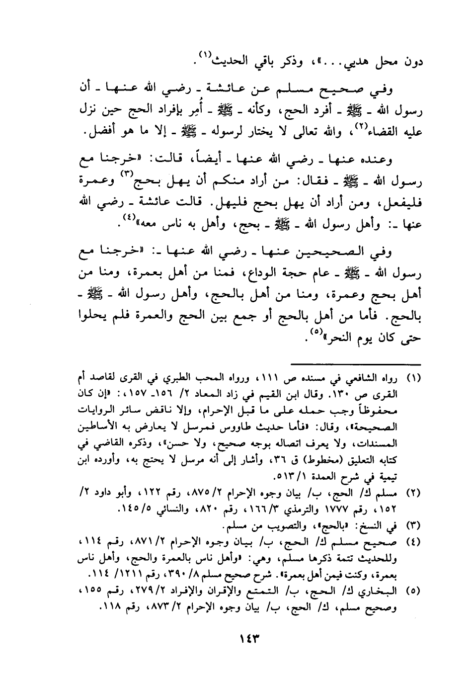 وَفِي الصَّحِيحَيْنِ عَنْهَا - رَضِي الله عَنْهَا -: " خرجنَا مَعَ رَسُول الله - صَلَّى اللَّهُ عَلَيْهِ وَسَلَّم َ - عَام حجَّة الْوَدَاع، فمنا من أهل بِعُمْرَة، وَمنا من أهل بِحَجّ وَعمرَة، وَمنا من أهل بِالْحَجِّ، وَأهل رَسُول الله - صَلَّى اللَّهُ عَلَيْهِ وَسَلَّم َ - بِالْحَجِّ. فَأَما من أهل بِالْحَجِّ أَو جمع بَين الْحَج وَالْعمْرَة فَلم يحلوا حَتَّى كَانَ يَوْم النَّحْر ".