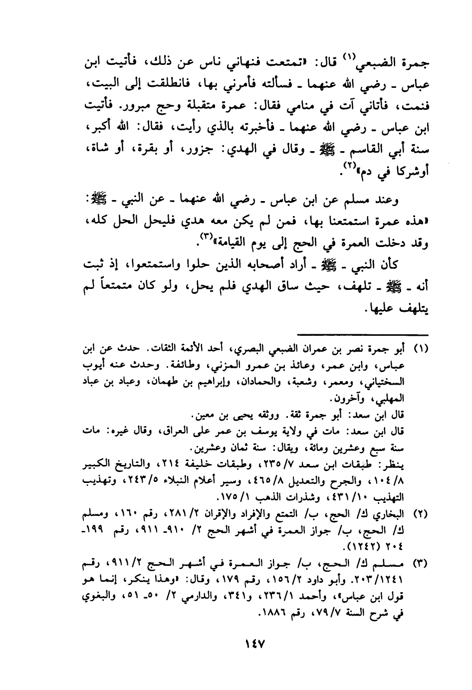 جَمْرَة الضبعِي قَالَ: " تمتعت فنهاني نَاس عَن ذَلِك، فَأتيت ابْن عَبَّاس - رَضِي الله عَنْهُمَا - فَسَأَلته فَأمرنِي بهَا، فَانْطَلَقت إِلَى الْبَيْت، فَنمت، فَأَتَانِي آتٍ فِي مَنَامِي فَقَالَ: عمْرَة متقبلة وَحج مبرور، فَأتيت ابْن عَبَّاس - رَضِي الله عَنْهُمَا - فَأَخْبَرته بِالَّذِي رَأَيْت، فَقَالَ: الله أكبر، سنة أبي الْقَاسِم - صَلَّى اللَّهُ عَلَيْهِ وَسَلَّم َ - وَقَالَ فِي الْهَدْي: جزور، أَو بقرة، أَو شَاة، أَو شركا فِي دم ".