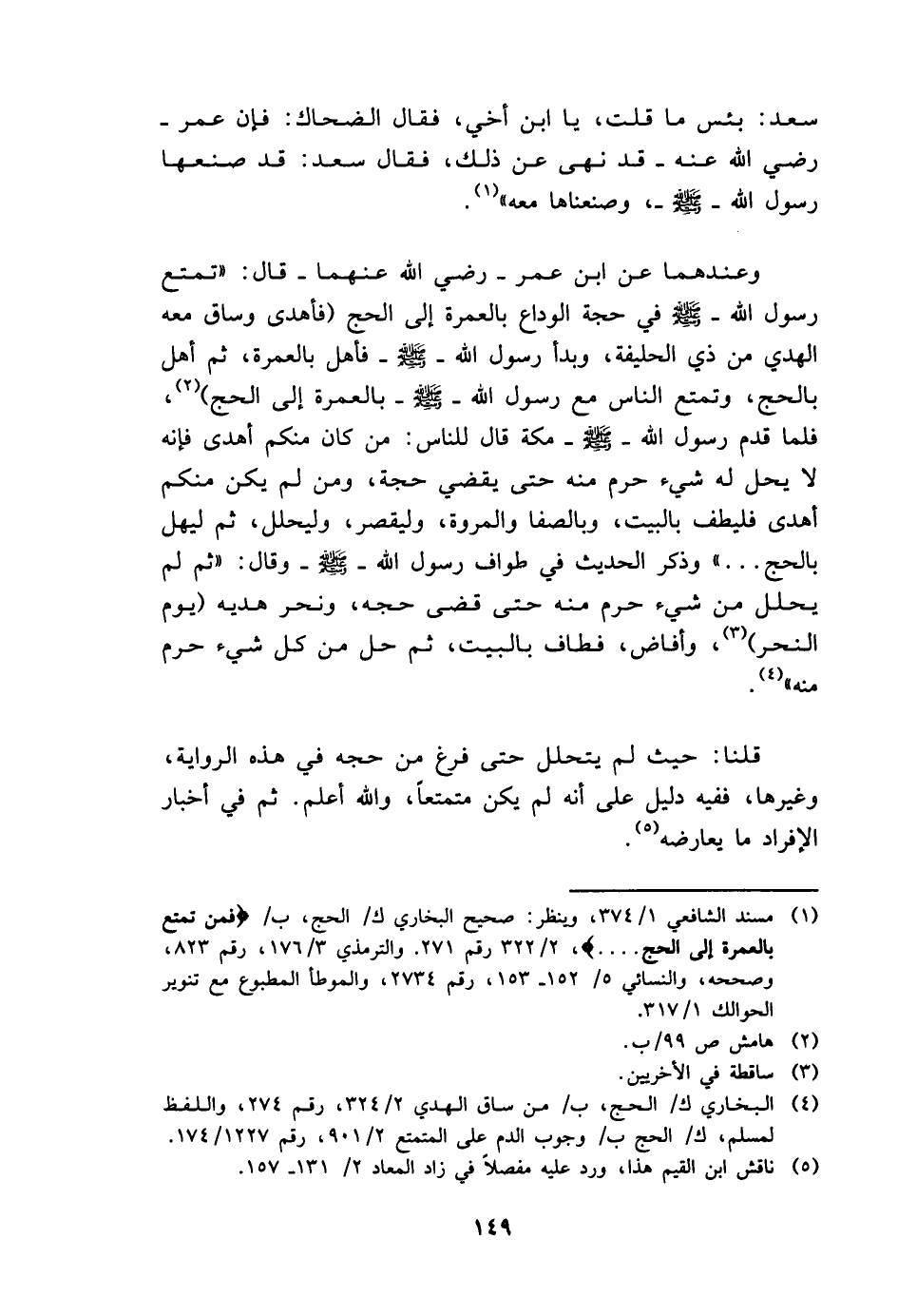سعد: بئس مَا فعلت، يَا ابْن أخي، فَقَالَ الضَّحَّاك: فَإِن عمر - رَضِي الله عَنهُ - قد نهى عَن ذَلِك، فَقَالَ سعد: قد صنعها رَسُول الله - صَلَّى اللَّهُ عَلَيْهِ وَسَلَّم َ -، وصنعناها مَعَه ".