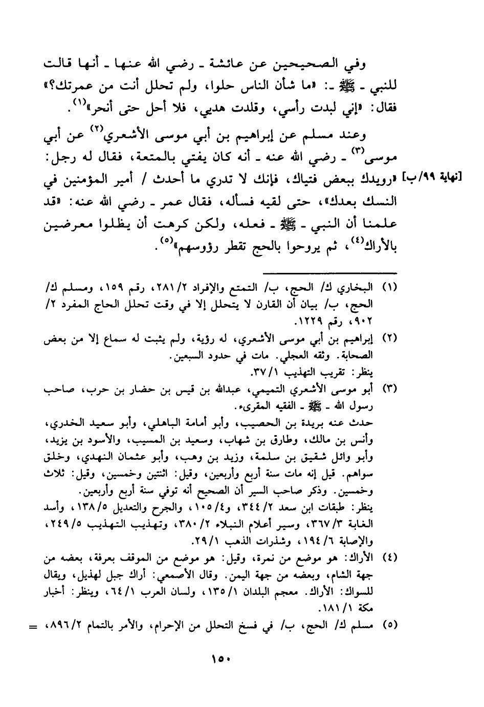 وَعند مُسلم عَن إِبْرَاهِيم بن أبي مُوسَى الْأَشْعَرِيّ عَن أبي مُوسَى - رَضِي الله عَنهُ - أَنه كَانَ يُفْتِي بِالْمُتْعَةِ، فَقَالَ لَهُ رجل: " رويدك بِبَعْض فتياك، فَإنَّك لَا تَدْرِي مَا أحدث / أَمِير الْمُؤمنِينَ فِي النّسك بعْدك "، حَتَّى لقِيه فَسَأَلَهُ، فَقَالَ عمر - رَضِي الله عَنهُ: " قد علمنَا أَن النَّبِي - صَلَّى اللَّهُ عَلَيْهِ وَسَلَّم َ - فعله، وَلَكِن كرهت أَن يظلوا معرضين بالأراك، ثمَّ يروحوا بِالْحَجِّ تقطر رؤوسهم "