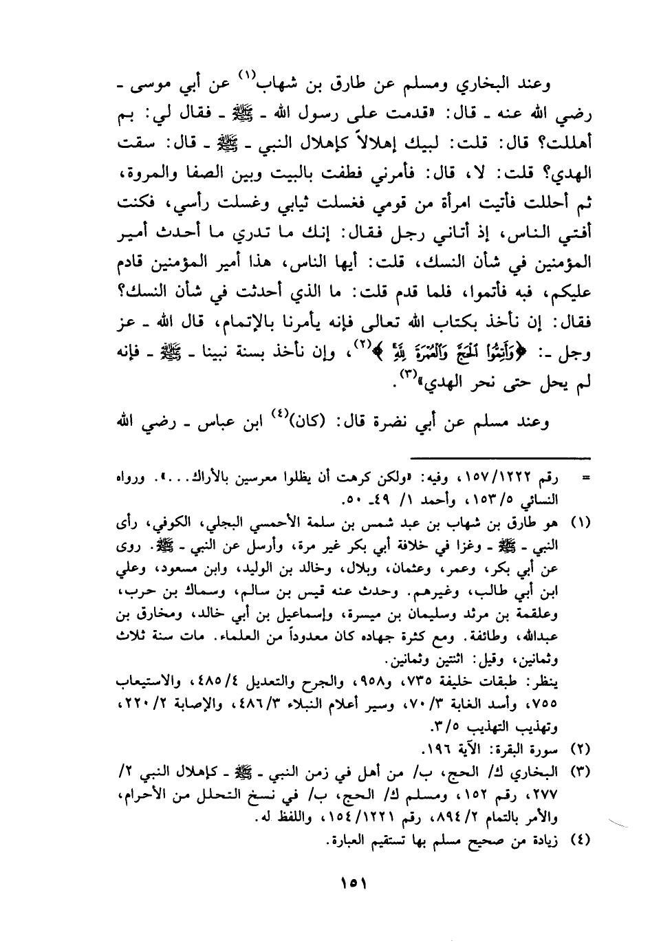 وَعند البُخَارِيّ وَمُسلم عَن طَارق بن شهَاب عَن أبي مُوسَى - رَضِي الله عَنهُ - قَالَ: " قدمت على رَسُول الله - صَلَّى اللَّهُ عَلَيْهِ وَسَلَّم َ - فَقَالَ لي: بِمَ أَهلَلْت؟ قَالَ: قلت: لبيْك إهلالاً كإهلال النَّبِي - صَلَّى اللَّهُ عَلَيْهِ وَسَلَّم َ - قَالَ: سقت الْهَدْي؟ قلت: لَا، قَالَ: فَأمرنِي فطفت بِالْبَيْتِ وَبَين الصَّفَا والمروة، ثمَّ أحللت فَأتيت امْرَأَة من قومِي فغسلت ثِيَابِي وغسلت رَأْسِي، فَكنت أُفْتِي النَّاس، إِذْ أَتَانِي رجل فَقَالَ: إِنَّك مَا تَدْرِي مَا أحدث أَمِير الْمُؤمنِينَ فِي شَأْن النّسك، قلت: أَيهَا النَّاس، هَذَا أَمِير الْمُؤمنِينَ قادم عَلَيْكُم، فبه فَأتمُّوا، فَلَمَّا قدم قلت: مَا الَّذِي أحدثت فِي شَأْن النّسك؟ فَقَالَ: إِن نَأْخُذ بِكِتَاب الله تَعَالَى فَإِنَّهُ يَأْمُرنَا بالإتمام، قَالَ الله - عز وَجل: {وَأَتمُّوا الْحَج وَالْعمْرَة لله} ، وَإِن نَأْخُذ بِسنة نَبينَا - صَلَّى اللَّهُ عَلَيْهِ وَسَلَّم َ - فَإِنَّهُ لم يحل حَتَّى نحر الْهَدْي ".