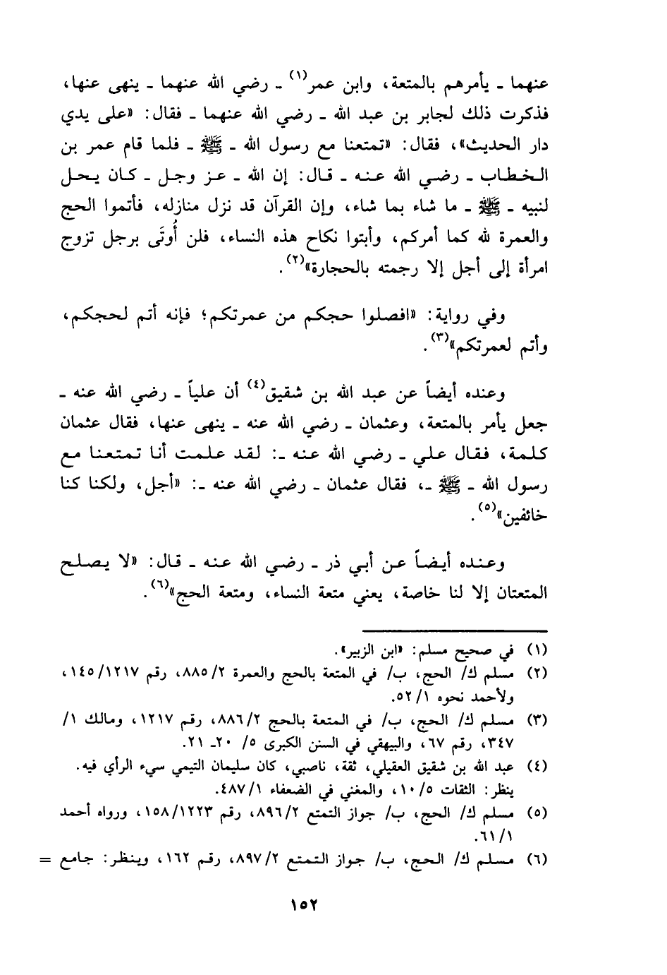 وَعِنْده أَيْضا عَن عبد الله بن شَقِيق أَن عليا - رَضِي الله عَنهُ - جعل يَأْمر بِالْمُتْعَةِ، وَعُثْمَان - رَضِي الله عَنهُ - ينْهَى عَنْهَا، فَقَالَ عُثْمَان كلمة، فَقَالَ عَليّ - رَضِي الله عَنهُ -: لقد علمت أَنا تَمَتعنَا مَعَ رَسُول الله - صَلَّى اللَّهُ عَلَيْهِ وَسَلَّم َ -، فَقَالَ عُثْمَان - رَضِي الله عَنهُ -: " أجل، وَلَكنَّا كُنَّا خَائِفين ".
