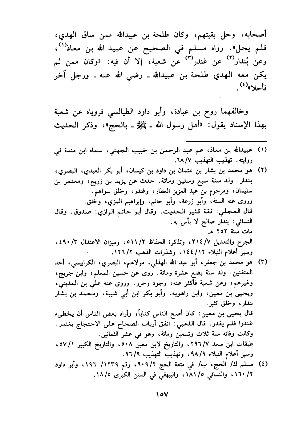أَصْحَابه، وَحل بَقِيَّتهمْ، وَكَانَ طَلْحَة بن عبيد الله مِمَّن سَاق الْهَدْي، فَلم يحل "، رَوَاهُ مُسلم فِي الصَّحِيح عَن عبيد الله بن معَاذ، وَعَن بنْدَار عَن غنْدر عَن شُعْبَة، إِلَّا أَن فِيهِ: " وَكَانَ مِمَّن لم يكن مَعَه الْهَدْي طَلْحَة بن عبيد الله - رَضِي الله عَنهُ - وَرجل آخر فأحلا ".
