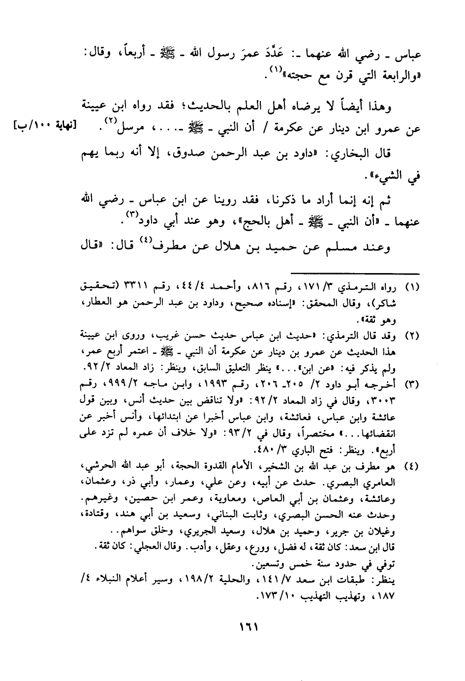 عَبَّاس - رَضِي الله عَنْهُمَا -: عدد عمر رَسُول الله - صَلَّى اللَّهُ عَلَيْهِ وَسَلَّم َ - أربعاُ، وَقَالَ: " وَالرَّابِعَة الَّتِي قرن مَعَ حجَّته ".