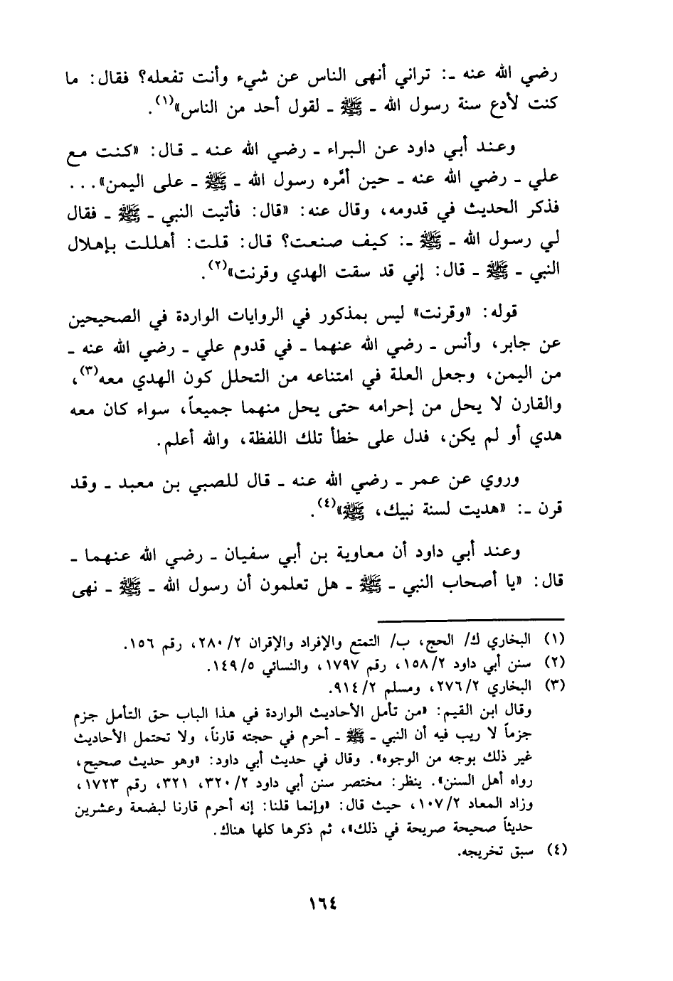 وَعند أبي دَاوُد عَن الْبَراء - رَضِي الله عَنهُ - قَالَ: " كنت مَعَ عَليّ - رَضِي الله عَنهُ - حِين أمره رَسُول الله - صَلَّى اللَّهُ عَلَيْهِ وَسَلَّم َ - على الْيمن " ... فَذكر الحَدِيث فِي قدومه، وَقَالَ عَنهُ: " قَالَ: فَأتيت النَّبِي - صَلَّى اللَّهُ عَلَيْهِ وَسَلَّم َ - فَقَالَ لي رَسُول الله - صَلَّى اللَّهُ عَلَيْهِ وَسَلَّم َ - كَيفَ صنعت؟ قَالَ: قلت: أَهلَلْت بإهلال النَّبِي - صَلَّى اللَّهُ عَلَيْهِ وَسَلَّم َ - قَالَ: إِنِّي قد سقت الْهَدْي وقرنت ".
