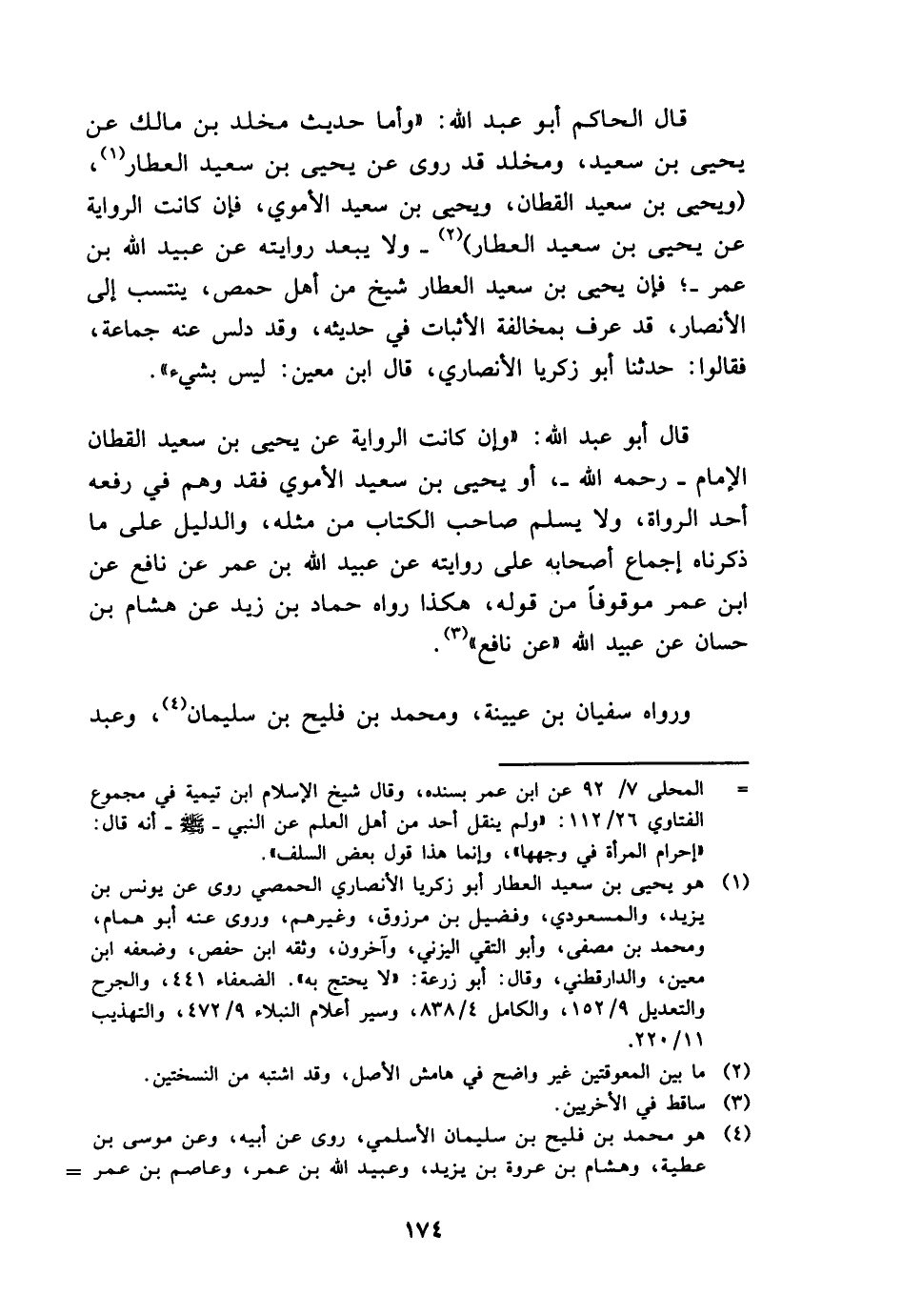قَالَ أَبُو عبد الله: " وَإِن كَانَت الرِّوَايَة عَن يحيى بن سعيد الْقطَّان الإِمَام - رَحمَه الله -، أَو يحيى بن سعيد الْأمَوِي فقد وهم فِي رَفعه أحد الروَاة، وَلَا يسلم صَاحب الْكتاب من مثله، وَالدَّلِيل على مَا ذَكرْنَاهُ إِجْمَاع أَصْحَابه على رِوَايَته عَن عبيد الله بن عمر عَن نَافِع عَن ابْن عمر مَوْقُوفا من قَوْله، هَكَذَا رَوَاهُ حَمَّاد بن زيد عَن هِشَام بن حسان عَن عبيد الله " عَن نَافِع ".