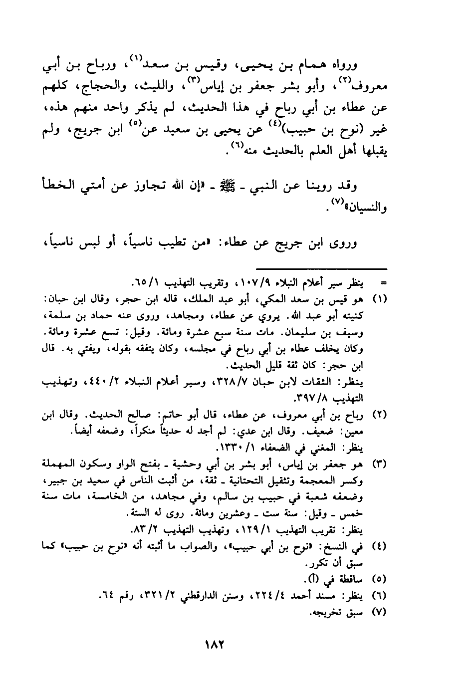 وَرَوَاهُ همام بن يحيى، وَقيس بن سعد، ورباح بن أبي مَعْرُوف، وَأَبُو بشر جَعْفَر بن إِيَاس، وَاللَّيْث، وَالْحجاج، كلهم عَن عَطاء بن أبي رَبَاح فِي هَذَا الحَدِيث، لم يذكر وَاحِد مِنْهُم هَذِه، غير (نوح بن حبيب) عَن يحيى بن سعيد عَن ابْن جريج، وَلم يقبلهَا أهل الْعلم بِالْحَدِيثِ مِنْهُ.
