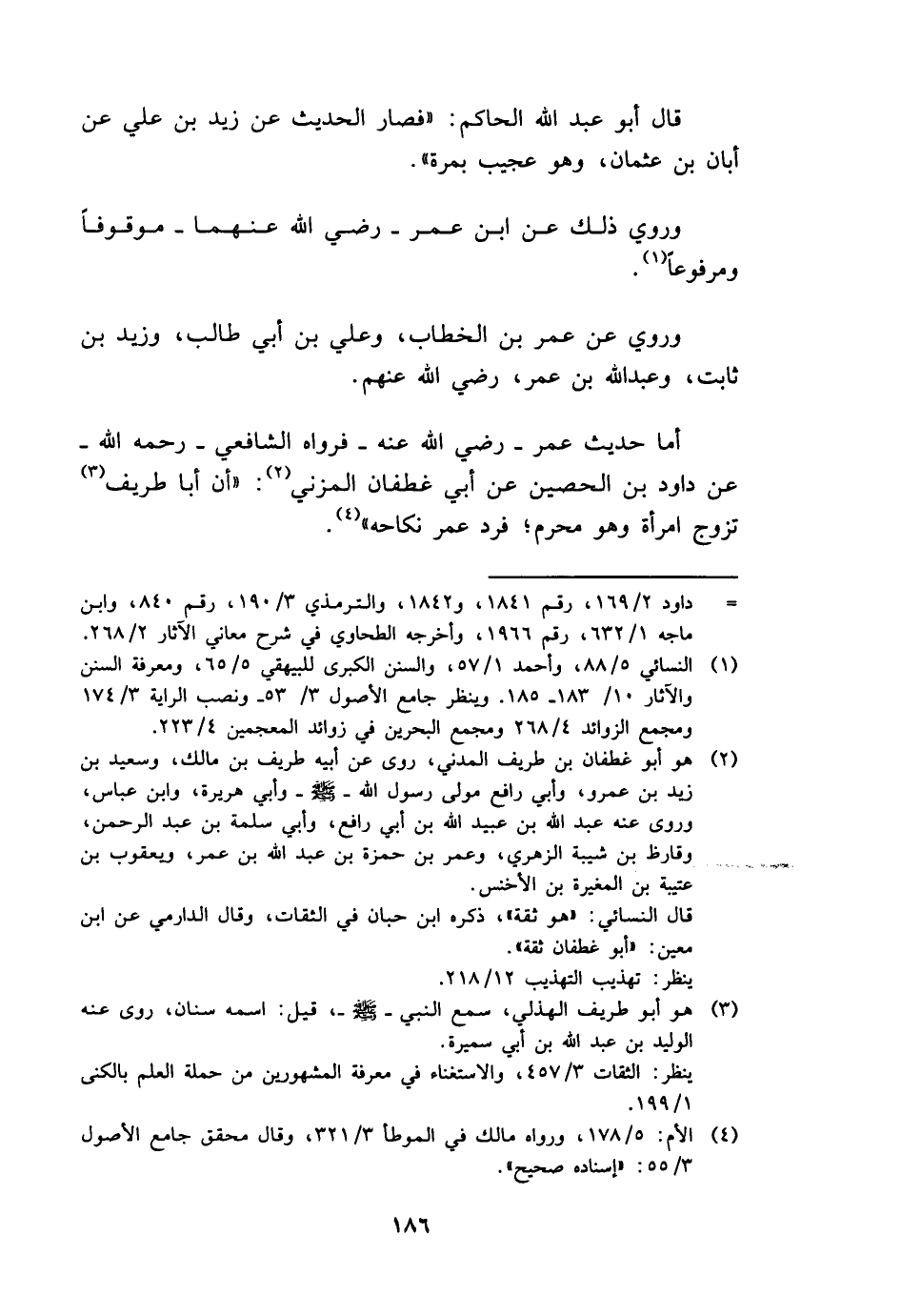 أما حَدِيث عمر - رَضِي الله عَنهُ - فَرَوَاهُ الشَّافِعِي - رَحمَه الله - عَن دَاوُد بن الْحصين عَن أبي غطفان الْمُزنِيّ: " أَن أَبَا طريف تزوج امْرَأَة وَهُوَ محرم، فَرد عمر نِكَاحه ".