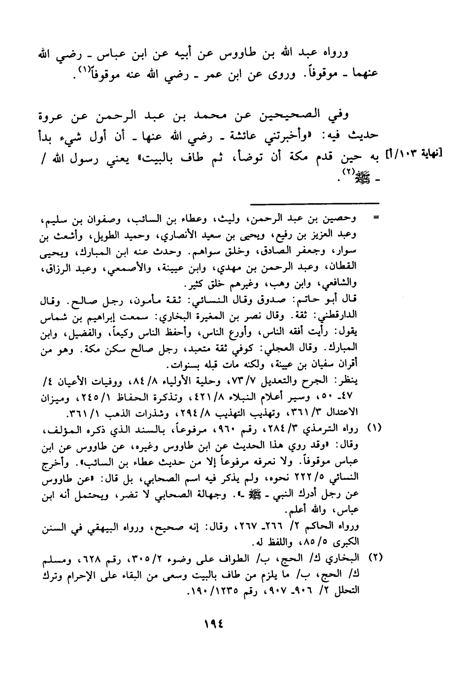 وَفِي الصَّحِيحَيْنِ عَن مُحَمَّد بن عبد الرَّحْمَن عَن عُرْوَة حَدِيث فِيهِ: " وأخبرتني عَائِشَة - رَضِي الله عَنْهَا - أَن أول شَيْء بَدَأَ بِهِ حِين قدم مَكَّة أَن تَوَضَّأ، ثمَّ طَاف بِالْبَيْتِ " يَعْنِي رَسُول الله / - صَلَّى اللَّهُ عَلَيْهِ وَسَلَّم َ -.