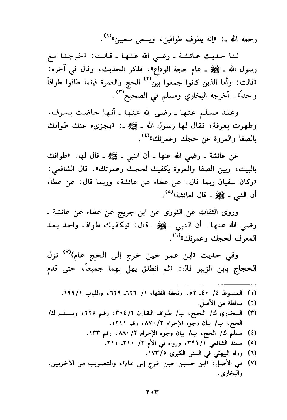 عَن عَائِشَة - رَضِي الله عَنْهَا - أَن النَّبِي - صَلَّى اللَّهُ عَلَيْهِ وَسَلَّم َ - قَالَ لَهَا: " طوافك بِالْبَيْتِ، وَبَين الصَّفَا والمروة يَكْفِيك لحجك وعمرتك ". قَالَ الشَّافِعِي: " وَكَانَ سُفْيَان رُبمَا قَالَ: عَن عَطاء عَن عَائِشَة، وَرُبمَا قَالَ: عَن عَطاء أَن النَّبِي - صَلَّى اللَّهُ عَلَيْهِ وَسَلَّم َ - قَالَ لعَائِشَة ".