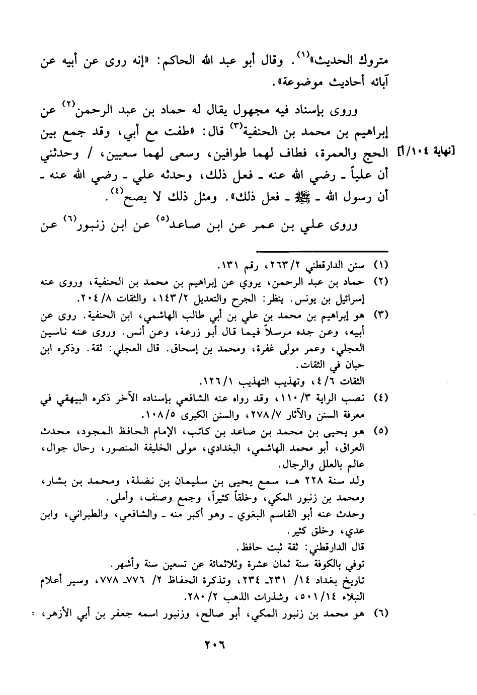 مَتْرُوك الحَدِيث ". وَقَالَ أَبُو عبد الله الْحَاكِم: " إِنَّه روى عَن أَبِيه عَن آبَائِهِ أَحَادِيث مَوْضُوعَة ". وروى بِإِسْنَاد فِيهِ مَجْهُول يُقَال لَهُ حَمَّاد بن عبد الرَّحْمَن عَن إِبْرَاهِيم بن مُحَمَّد بن الْحَنَفِيَّة قَالَ: " طفت مَعَ أبي، وَقد جمع بَين الْحَج وَالْعمْرَة، فَطَافَ لَهما طوافين، وسعى لَهما سعيين، / وحَدثني أَن عليا - رَضِي الله عَنهُ - فعل ذَلِك، وحدثه عَليّ - رَضِي الله عَنهُ - أَن رَسُول الله - صَلَّى اللَّهُ عَلَيْهِ وَسَلَّم َ - فعل ذَلِك ". وَمثل ذَلِك لَا يَصح.