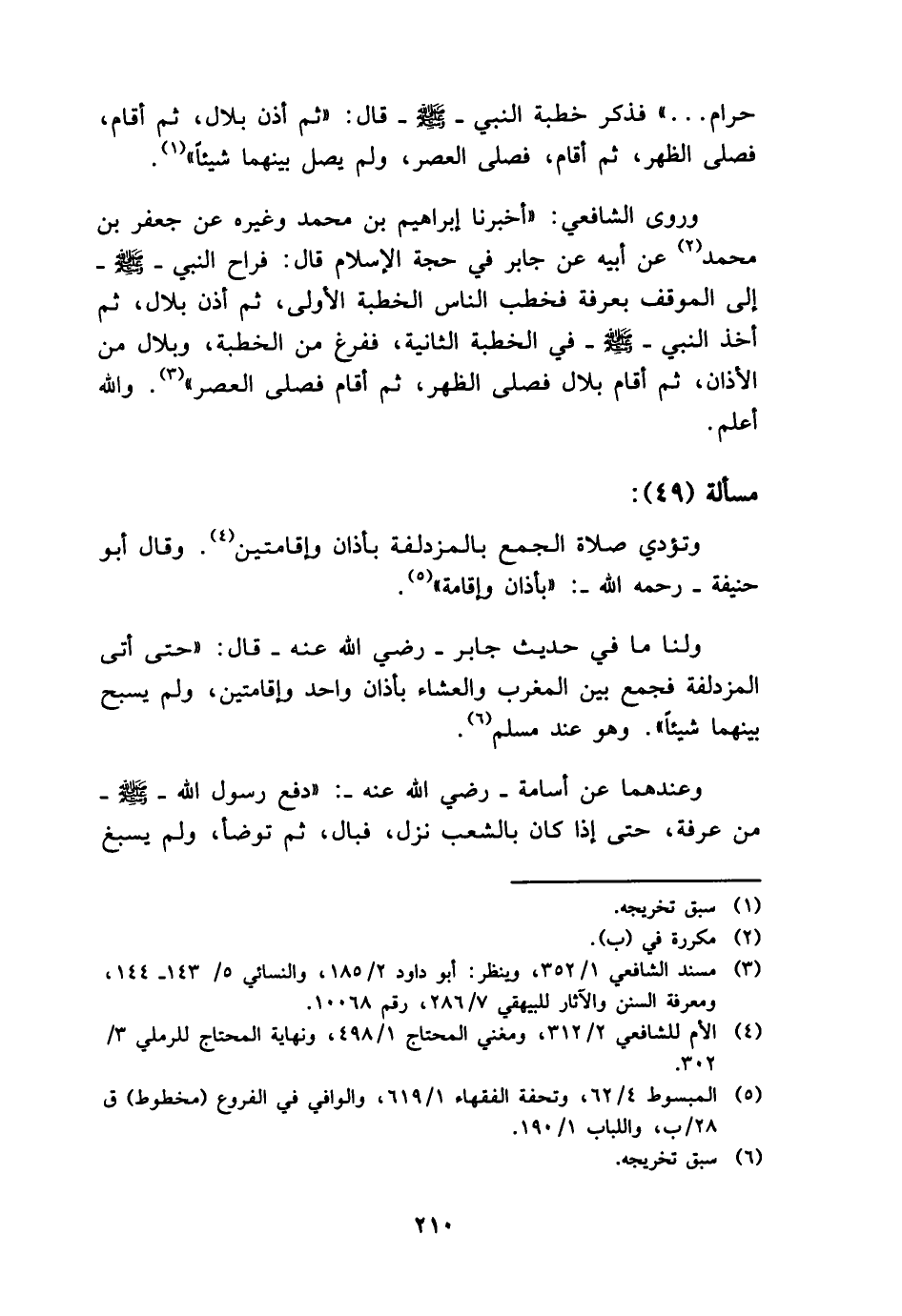 وروى الشَّافِعِي: " أخبرنَا إِبْرَاهِيم بن مُحَمَّد وَغَيره عَن جَعْفَر بن مُحَمَّد عَن أَبِيه عَن جَابر فِي حجَّة الْإِسْلَام قَالَ: فراح النَّبِي - صَلَّى اللَّهُ عَلَيْهِ وَسَلَّم َ - إِلَى الْموقف بِعَرَفَة فَخَطب النَّاس الْخطْبَة الأولى، ثمَّ أذن بِلَال، ثمَّ أَخذ النَّبِي - صَلَّى اللَّهُ عَلَيْهِ وَسَلَّم َ - فِي الْخطْبَة الثَّانِيَة، ففرغ من الْخطْبَة، وبلال من الْأَذَان، ثمَّ أَقَامَ بِلَال فصلى الظّهْر، ثمَّ أَقَامَ فصلى الْعَصْر ". وَالله أعلم.
