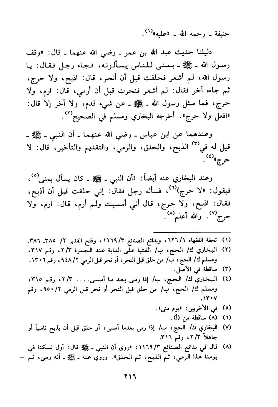 - عَن شَيْء قدم، وَلَا أخر إِلَّا قَالَ: " افْعَل وَلَا حرج ". أخرجه البُخَارِيّ وَمُسلم فِي الصَّحِيح.