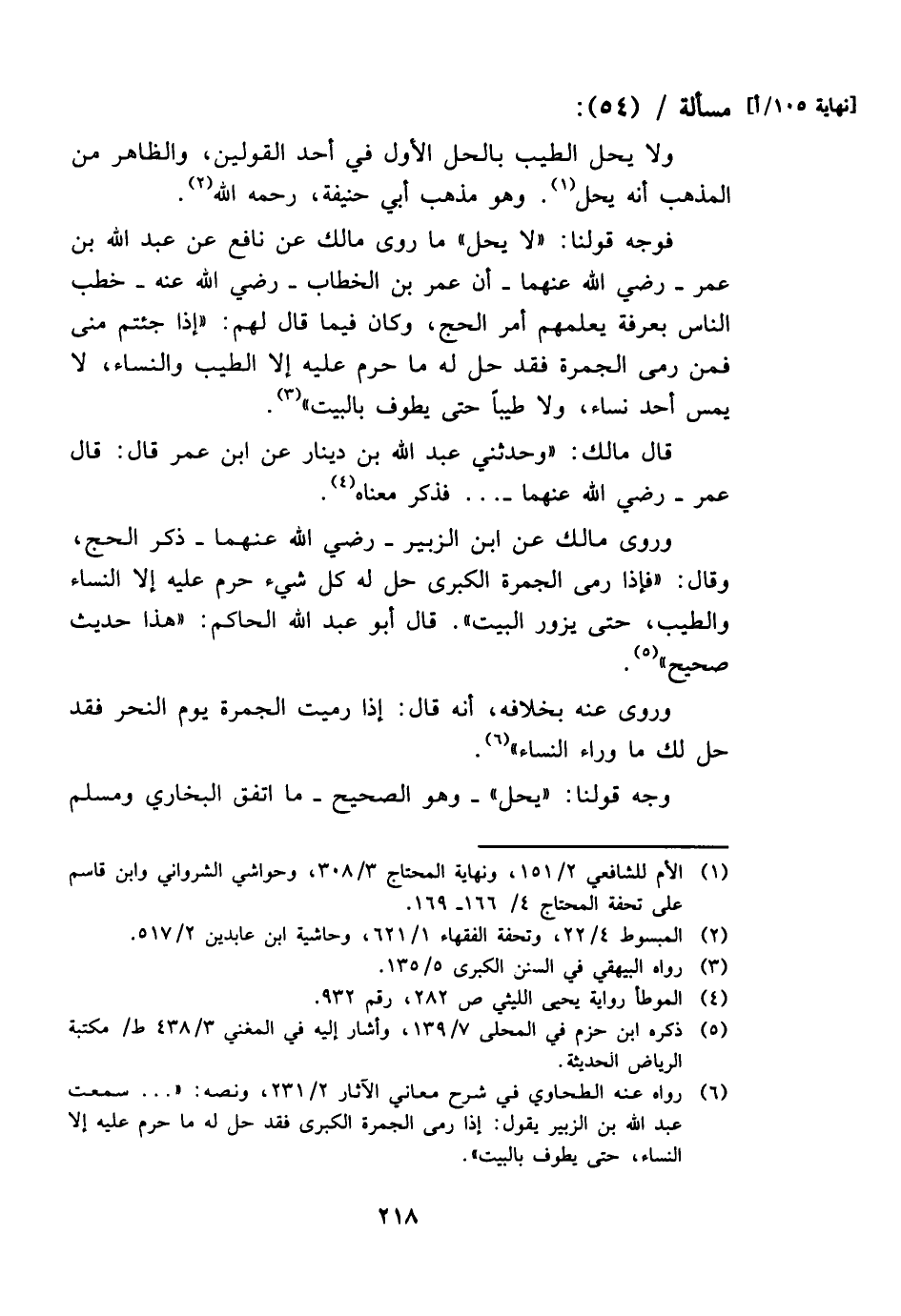 وروى مَالك عَن ابْن الزبير - رَضِي الله عَنْهُمَا - ذكر الْحَج، وَقَالَ: " فَإِذا رمى الْجَمْرَة الْكُبْرَى حل لَهُ كل شَيْء حرم عَلَيْهِ إِلَّا النِّسَاء وَالطّيب، حَتَّى يزور الْبَيْت ". قَالَ أَبُو عبد الله الْحَاكِم: " هَذَا حَدِيث صَحِيح ".