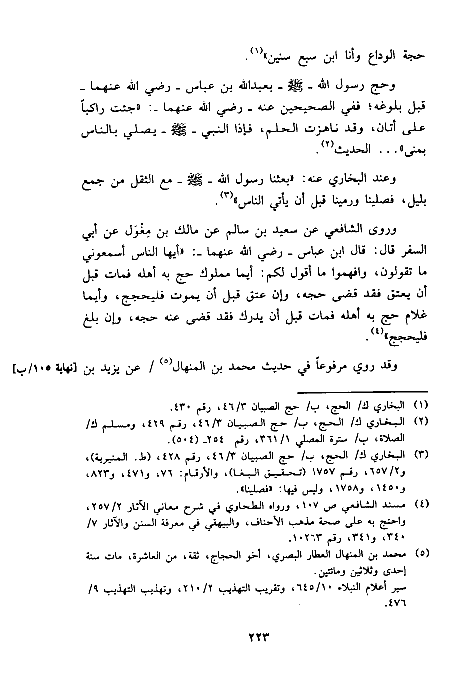 وَحج رَسُول الله - صَلَّى اللَّهُ عَلَيْهِ وَسَلَّم َ - بِعَبْد الله بن عَبَّاس - رَضِي الله عَنْهُمَا - قبل بُلُوغه؛ فَفِي الصَّحِيحَيْنِ عَنهُ - رَضِي الله عَنْهُمَا - " جِئْت رَاكِبًا على أتان، وَقد ناهزت الْحلم، فَإِذا النَّبِي - صَلَّى اللَّهُ عَلَيْهِ وَسَلَّم َ - يُصَلِّي بِالنَّاسِ بمنى " ... الحَدِيث.