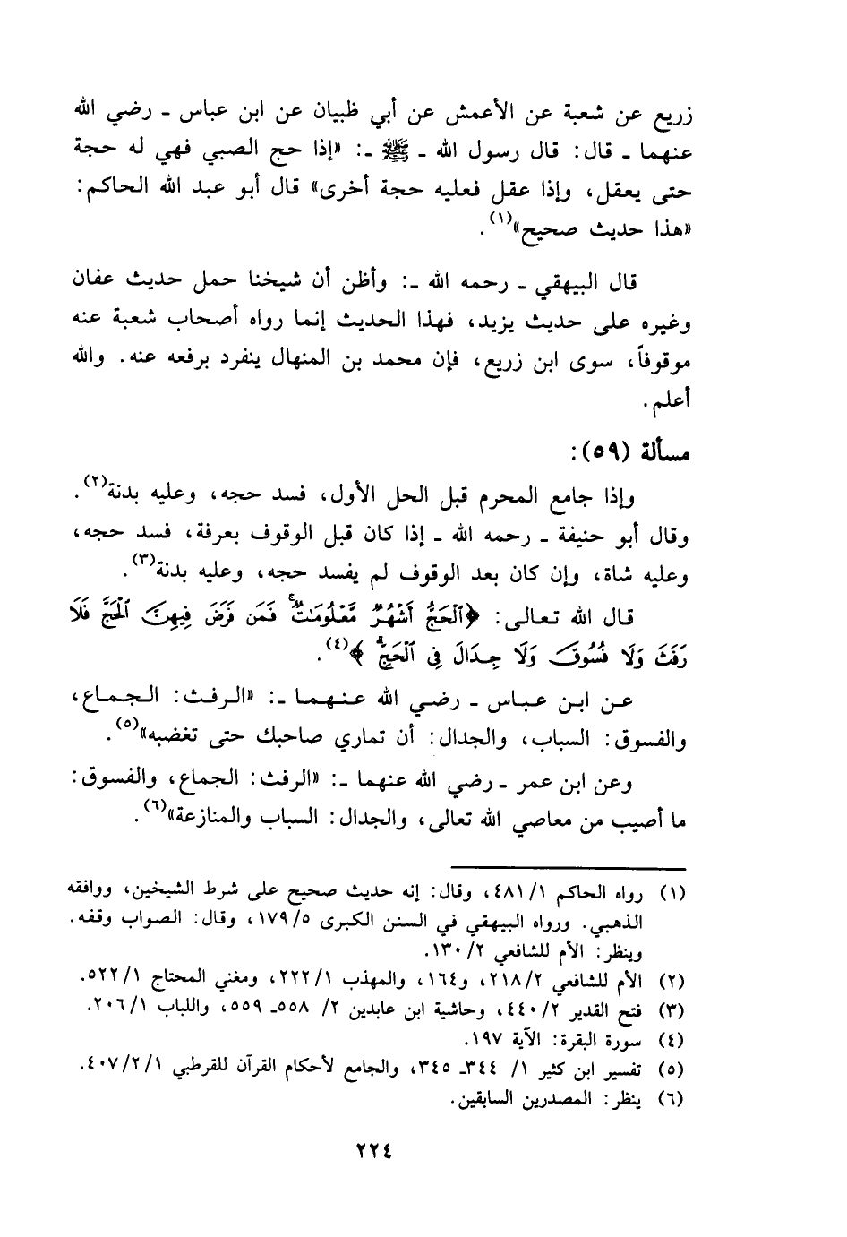 عَن ابْن عَبَّاس - رَضِي الله عَنْهُمَا -: " الرَّفَث: الْجِمَاع، والفسوق: السباب، والجدال: أَن تُمَارِي صَاحبك حَتَّى تغضبه ".
