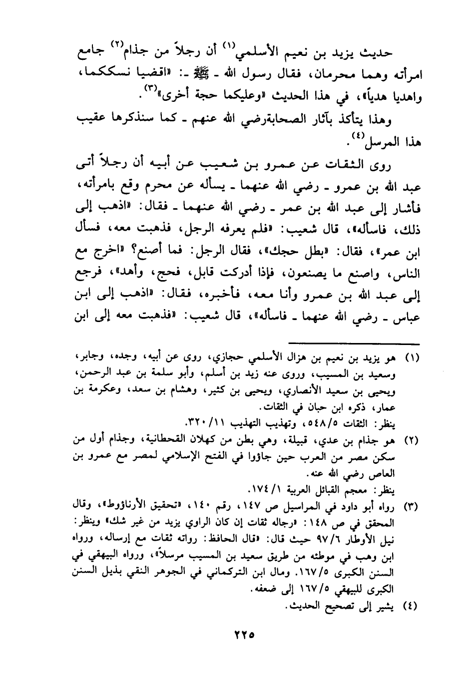 روى الثِّقَات عَن عَمْرو بن شُعَيْب عَن أَبِيه أَن رجلا أَتَى عبد الله بن عَمْرو - رَضِي الله عَنْهُمَا - يسْأَله عَن محرم وَقع بامرأته، فَأَشَارَ إِلَى عبد الله بن عمر - رَضِي الله عَنْهُمَا - فَقَالَ: " اذْهَبْ إِلَى ذَلِك، فَاسْأَلْهُ:، قَالَ شُعَيْب: " فَلم يعرفهُ الرجل، فَذَهَبت مَعَه، فَسَأَلَ ابْن عمر "، فَقَالَ " بَطل حجك "، فَقَالَ الرجل / فَمَا أصنع؟ " اخْرُج مَعَ النَّاس، واصنع مَا يصنعون، فَإِذا أدْركْت قَابل، فحج، وأهد "، فَرجع إِلَى عبد الله بن عَمْرو وَأَنا مَعَه، فَأخْبرهُ، فَقَالَ: ط اذْهَبْ إِلَى ابْن عَبَّاس - رَضِي الله عَنْهُمَا - فَاسْأَلْهُ "، قَالَ شُعَيْب: " فَذَهَبت مَعَه إِلَى ابْن
