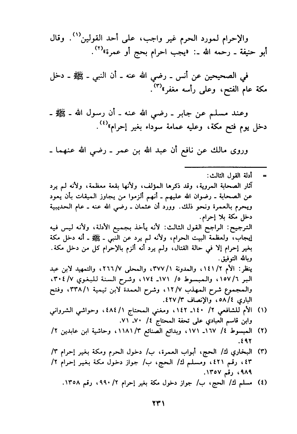 وَالْإِحْرَام لمورد الْحرم غير وَاجِب، على أحد الْقَوْلَيْنِ. وَقَالَ أَبُو حنيفَة - رَحمَه الله -: " يجب احرام بِحَجّ أَو عمْرَة ".
