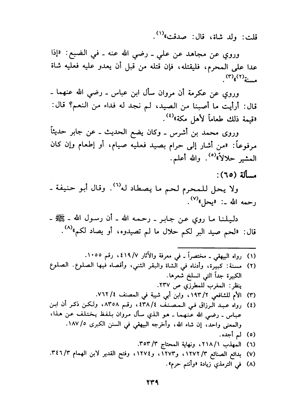 وَرُوِيَ عَن مُجَاهِد عَن عَليّ - رَضِي الله عَنهُ - فِي الضبع: " إِذا عدا على الْمحرم، فليقتله، فَإِن قَتله من قبل أَن يعدو عَلَيْهِ فَعَلَيهِ شَاة مُسِنَّة ".