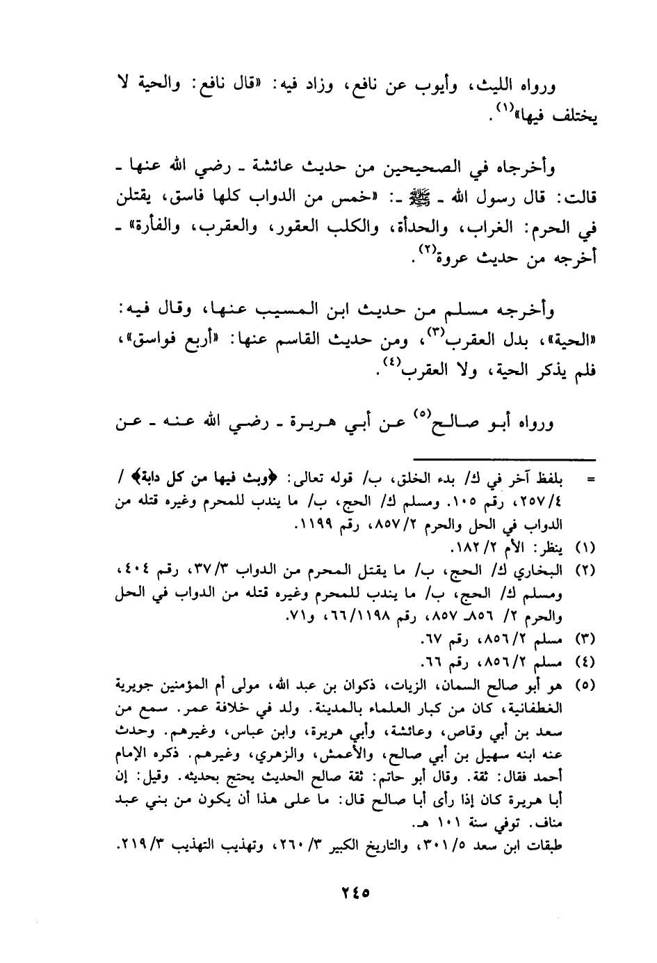 وَأخرجه مُسلم من حَدِيث ابْن الْمسيب عَنْهَا، وَقَالَ فِيهِ: " الْحَيَّة "، بدل الْعَقْرَب، وَمن حَدِيث الْقَاسِم عَنْهَا: " أَربع فواسق "، فَلم يذكر الْحَيَّة، وَلَا الْعَقْرَب.