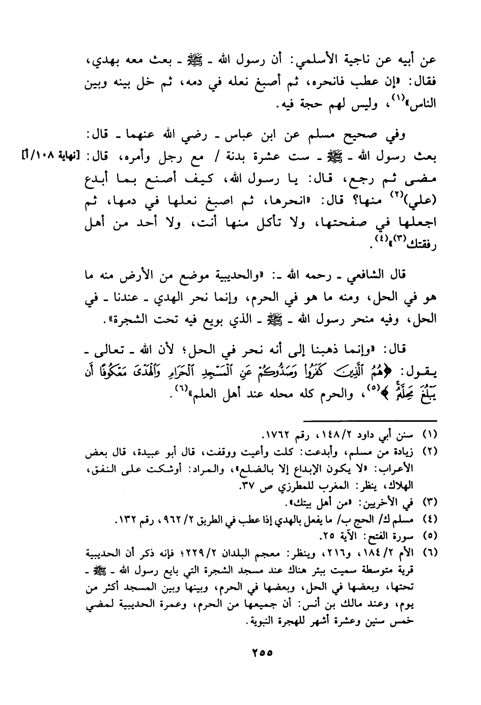 قَالَ الشَّافِعِي - رَحمَه الله -: " وَالْحُدَيْبِيَة مَوضِع من الأَرْض مِنْهُ مَا هُوَ فِي الْحل، وَمِنْه مَا هُوَ فِي الْحرم، وَإِنَّمَا نحر الْهَدْي - عندنَا - فِي الْحل، وَفِيه منحر رَسُول الله - صَلَّى اللَّهُ عَلَيْهِ وَسَلَّم َ - الَّذِي بُويِعَ فِيهِ تَحت الشَّجَرَة ".