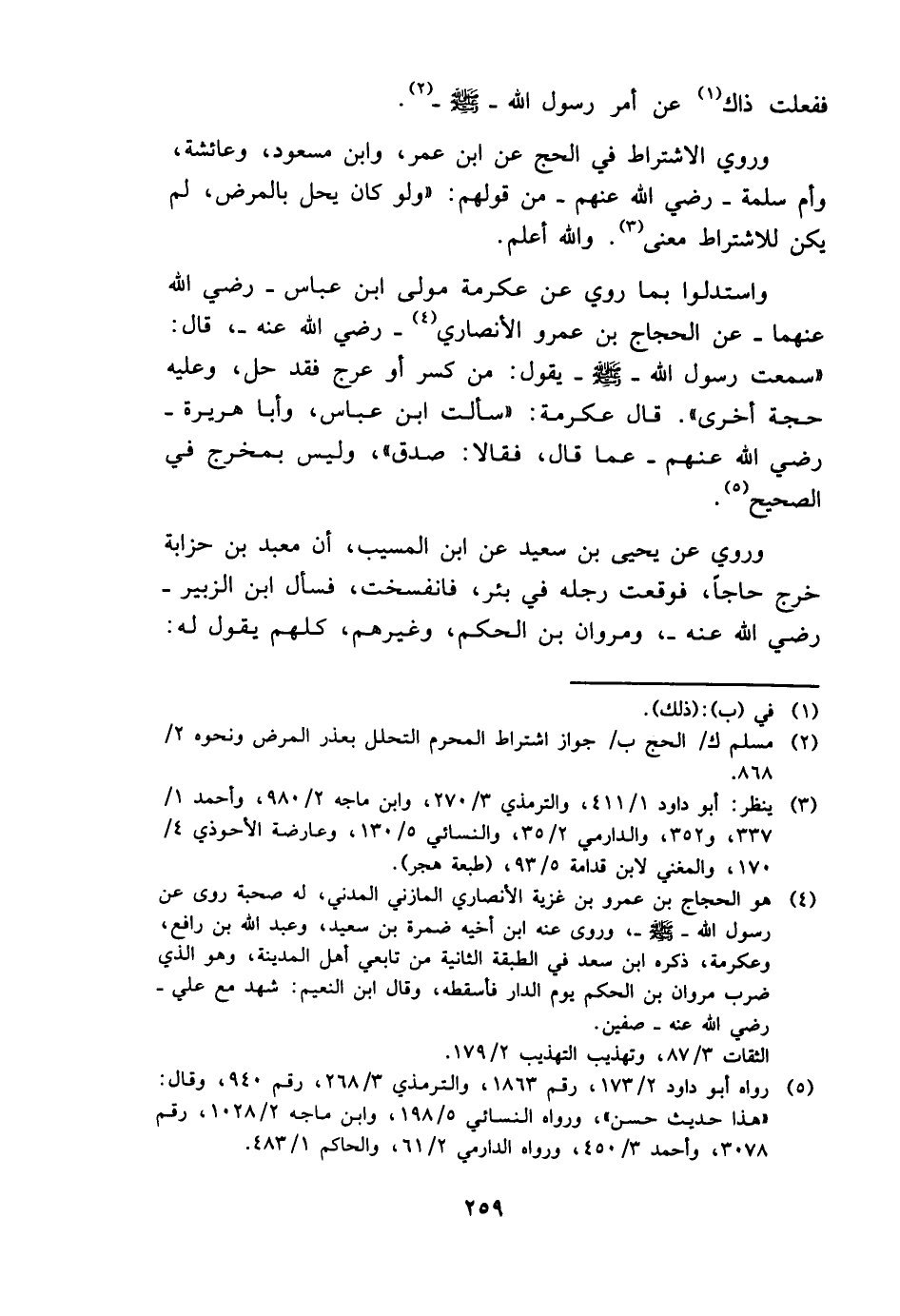 وَرُوِيَ الِاشْتِرَاط فِي الْحَج عَن ابْن عمر، وَابْن مَسْعُود، وَعَائِشَة، وَأم سَلمَة - رَضِي الله عَنْهُم - من قَوْلهم: " وَلَو كَانَ يحل بِالْمرضِ، لم يكن للاشتراط معنى. وَالله أعلم.