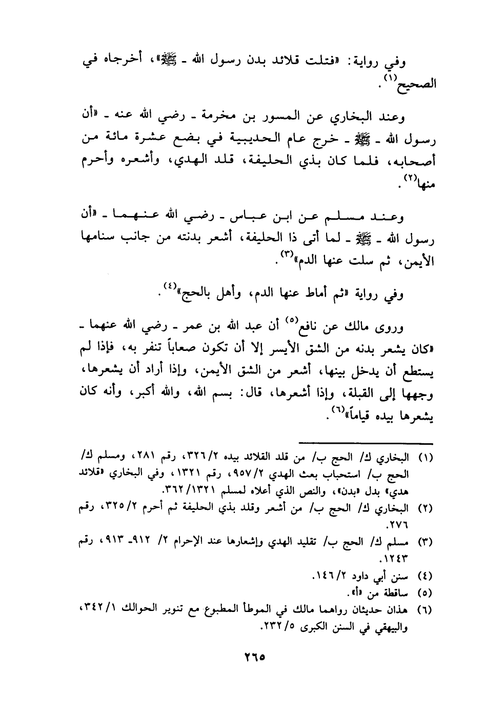 وَعند مُسلم عَن ابْن عَبَّاس - رَضِي الله عَنْهُمَا - " أَن رَسُول الله - صَلَّى اللَّهُ عَلَيْهِ وَسَلَّم َ - لما أَتَى ذَا الحليفة، أشعر بدنته من جَانب سنامها الْأَيْمن، ثمَّ سلت عَنْهَا الدَّم ".