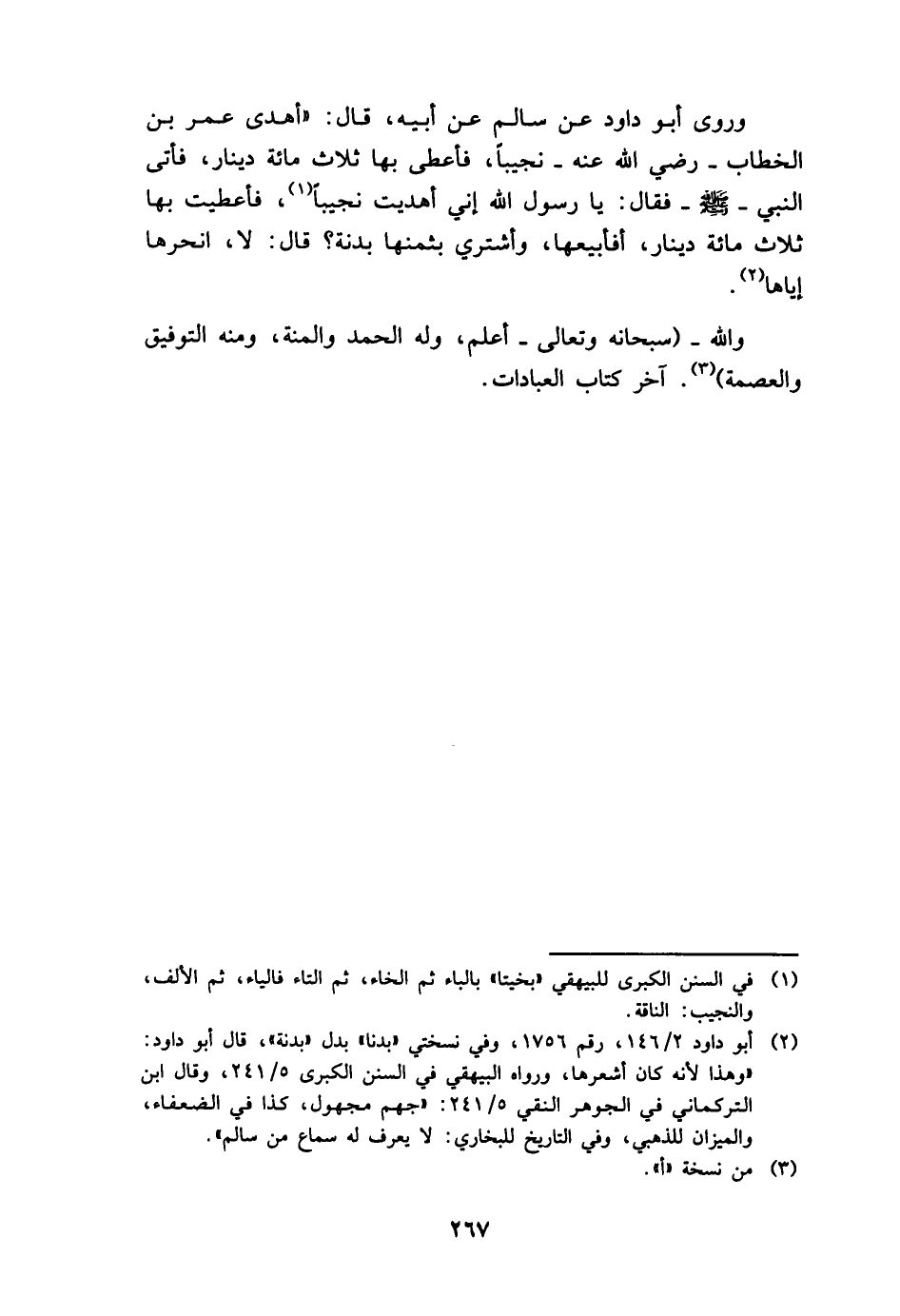 وروى أَبُو دَاوُد عَن سَالم عَن أَبِيه، قَالَ: " أهْدى عمر بن الْخطاب - رَضِي الله عَنهُ - نجيباً، فَأعْطى بهَا ثَلَاث مائَة دِينَار، فَأتى النَّبِي - صَلَّى اللَّهُ عَلَيْهِ وَسَلَّم َ - فَقَالَ: يَا رَسُول الله إِنِّي أهديت نجيباً، فَأعْطيت بهَا ثَلَاث مائَة دِينَار، أَفَأَبِيعهَا، وأشتري بِثمنِهَا بَدَنَة؟ قَالَ: لَا، انحرها إِيَّاهَا.