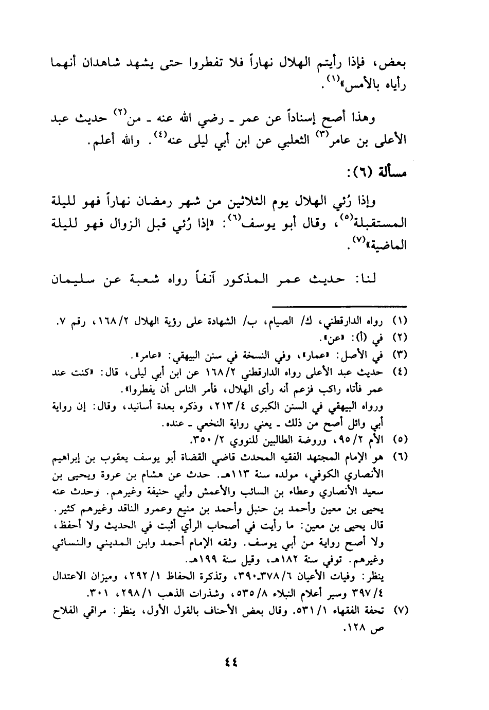 وَإِذا رئي الْهلَال يَوْم الثَّلَاثِينَ من شهر رَمَضَان نَهَارا فَهُوَ لليلة المستقبلية، وَقَالَ أَبُو يُوسُف: " إِذا رئي قبل الزَّوَال فَهُوَ لليلة الْمَاضِيَة ".