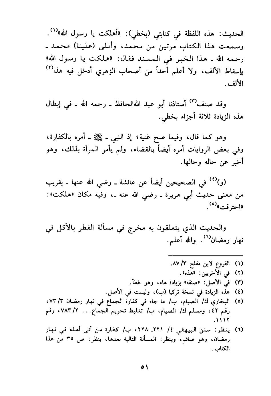 الحَدِيث: هَذِه اللَّفْظَة فِي كتابتي (بخطي) : أهلكت يَا رَسُول الله ". وَسمعت هَذَا الْكتاب مرَّتَيْنِ من مُحَمَّد، وأملى (علينا) مُحَمَّد - رَحمَه الله - هَذَا الْخَبَر فِي الْمسند فَقَالَ: " هَلَكت يَا رَسُول الله " بِإِسْقَاط الْألف، وَلَا أعلم أحدا من أَصْحَاب الزُّهْرِيّ أَدخل فِيهِ هَذَا الْألف.