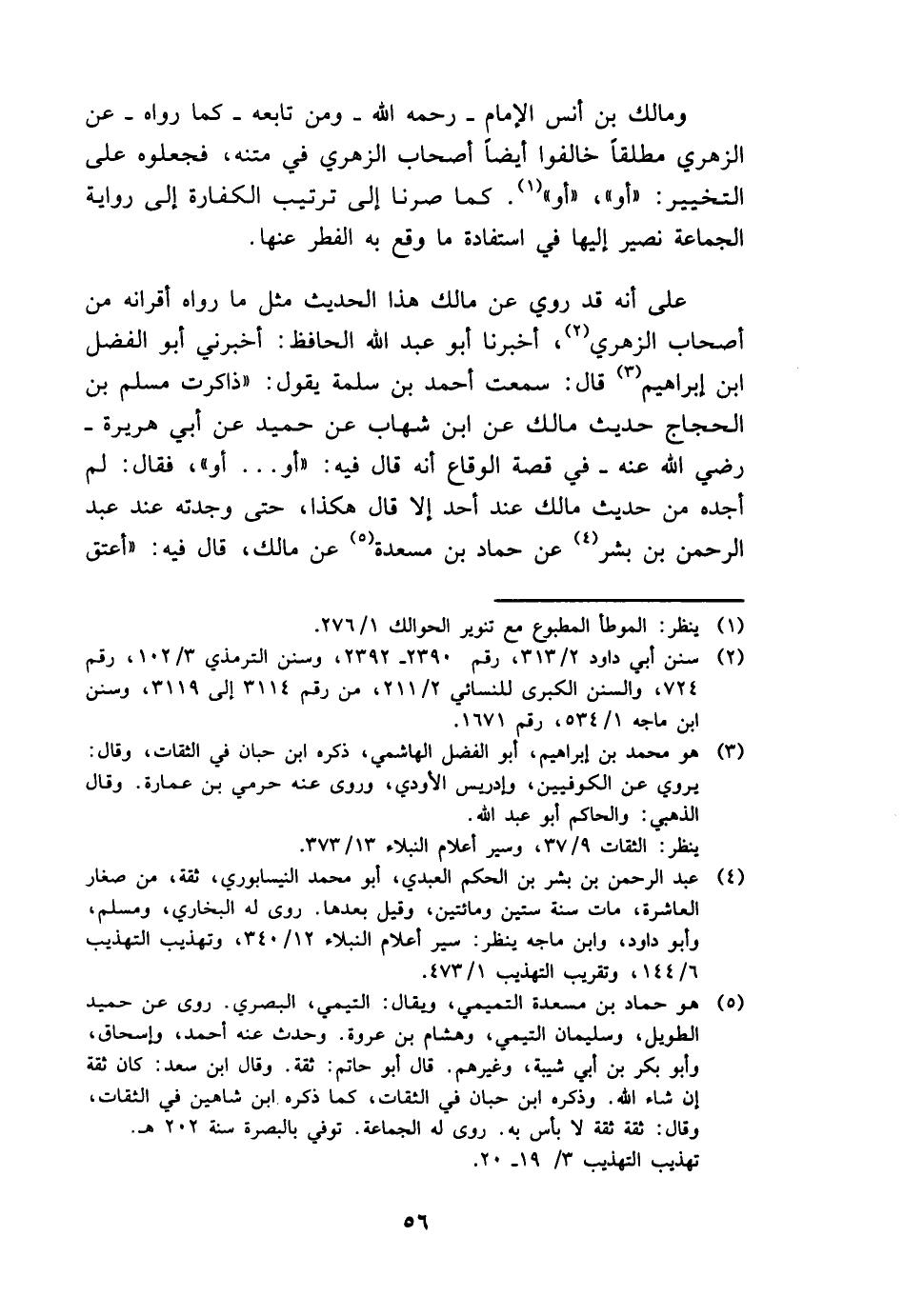 وَمَالك بن أنس الإِمَام - رَحمَه الله - وَمن تَابعه - كَمَا رَوَاهُ - عَن الزُّهْرِيّ مُطلقًا خالفوا أَيْضا أَصْحَاب الزُّهْرِيّ فِي مَتنه، فجعلوه على التَّخْيِير: " أَو "، " أَو ". كَمَا صرنا إِلَى تَرْتِيب الْكَفَّارَة إِلَى رِوَايَة الْجَمَاعَة نصير إِلَيْهَا فِي استفادة مَا وَقع بِهِ الْفطر عَنْهَا.